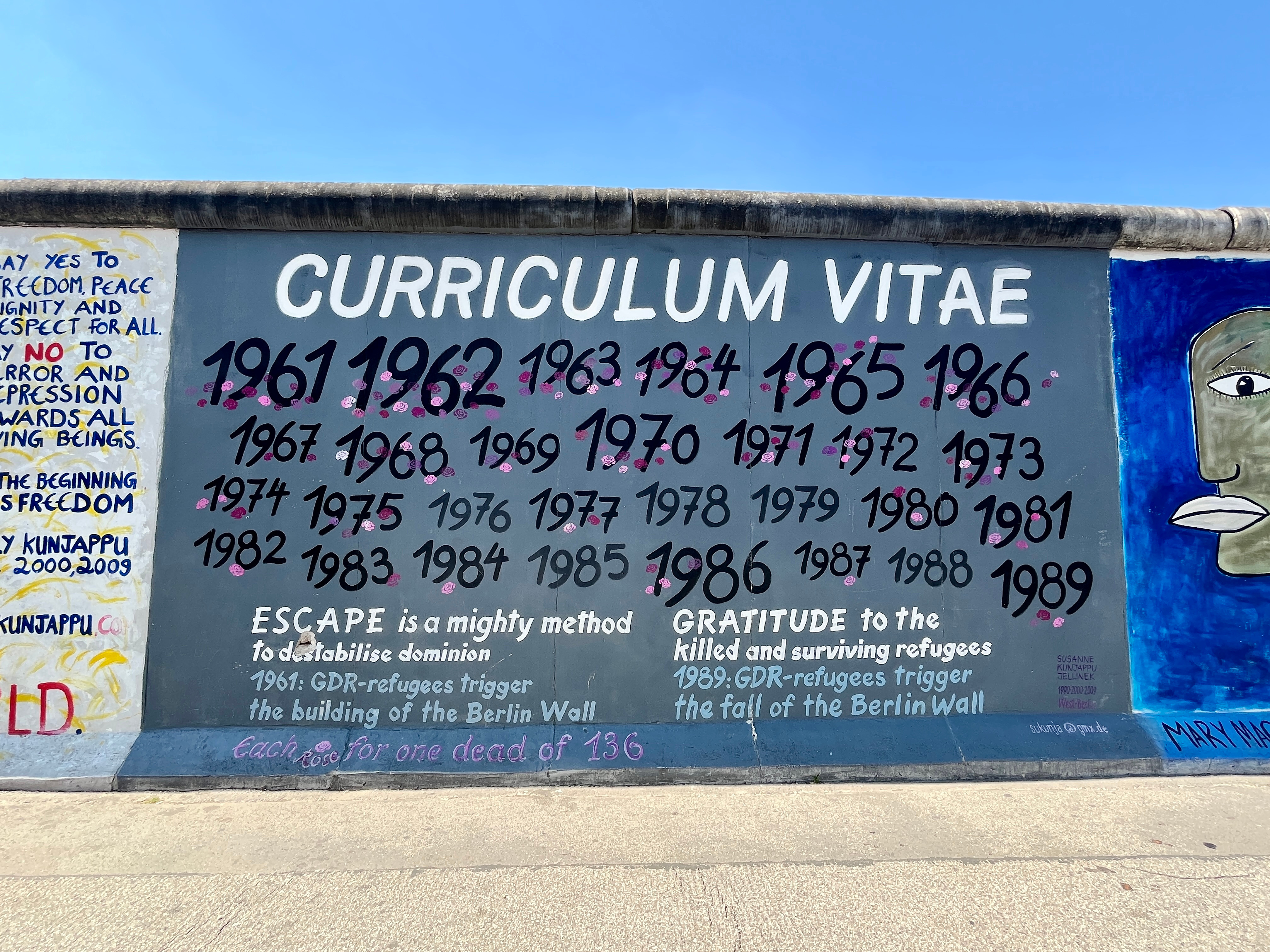 I have a view of the Berlin Wall from my hotel room: as I am writing this, I can see it out of the corner of my eye. The section outside my window forms the ‘East Side Gallery’, a stretch of remaining border wall turned into an open-air art gallery over 1km long.