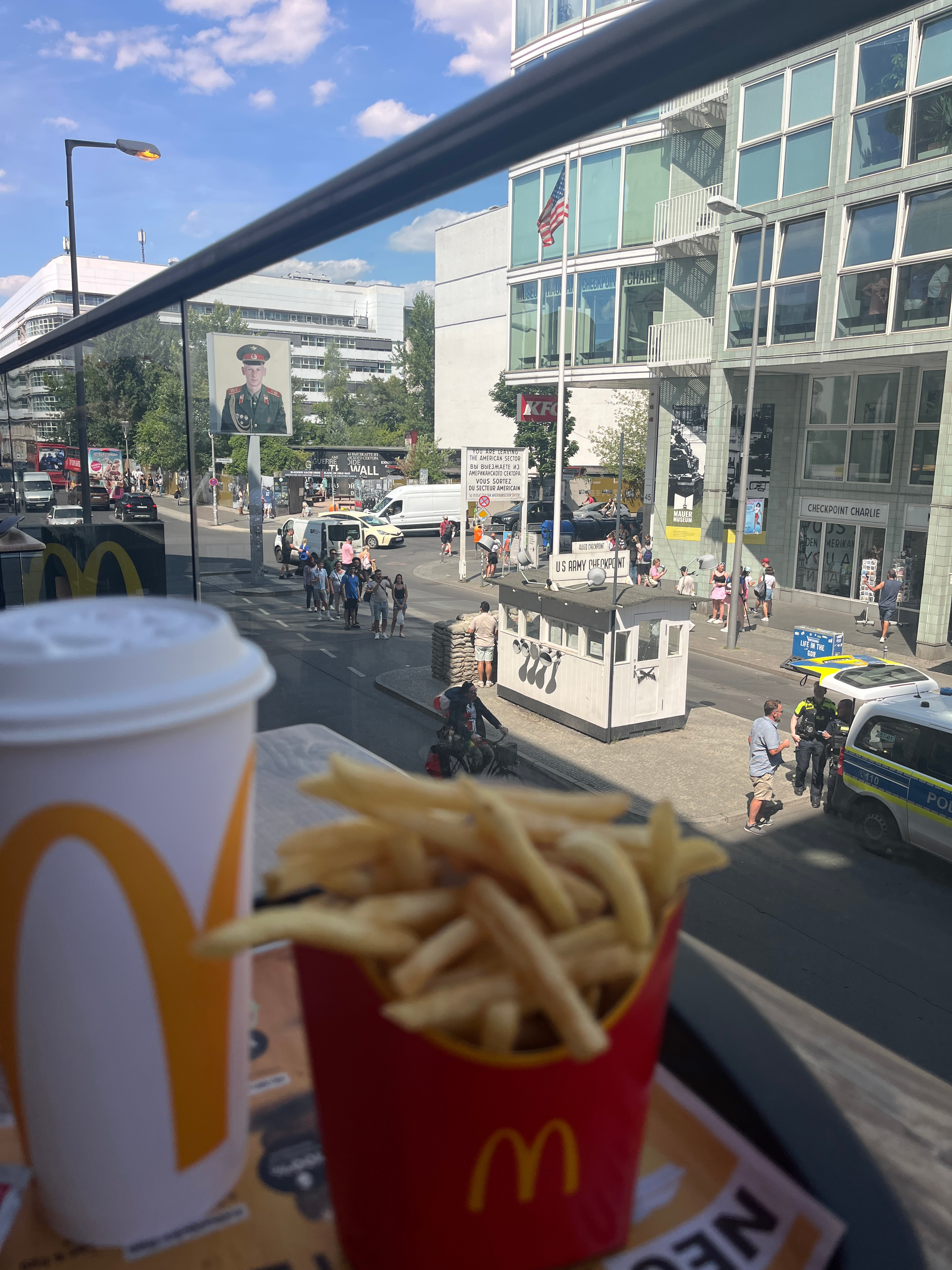 Take for example the fact that you can have McDonalds with a view of Checkpoint Charlie, a former border crossing, where during the Berlin Crisis in 1961 American and Soviet tanks faced each other. I enjoyed fries while being stared down by the large poster of a Soviet soldier and watching tourists queue to take family photos.