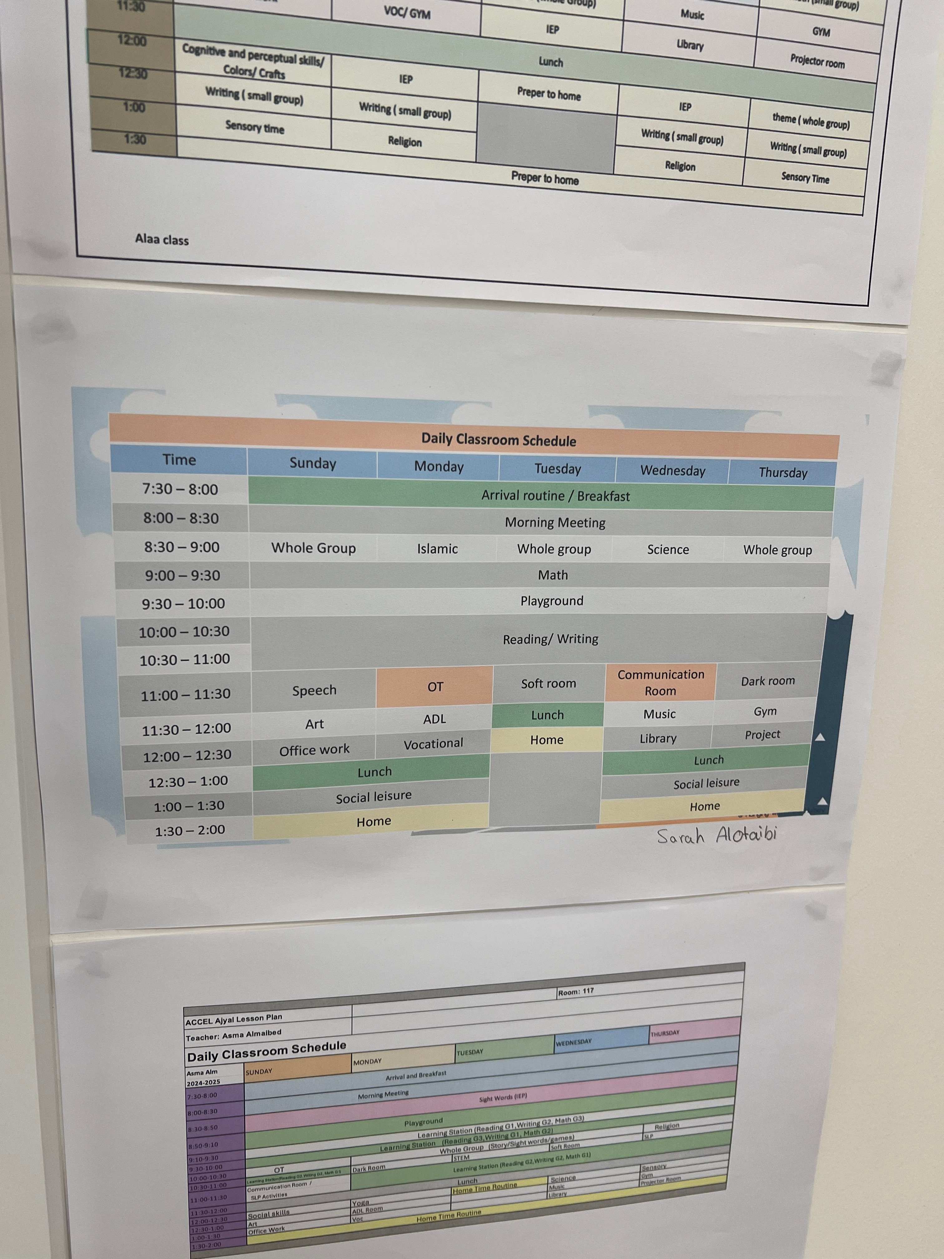 On the female campus, every classroom has a slightly different schedule. There are built-in periods in place to support their individualized needs, such as occupational therapy and ADLs (activities of daily living). Here's an example of a classroom's schedule below.