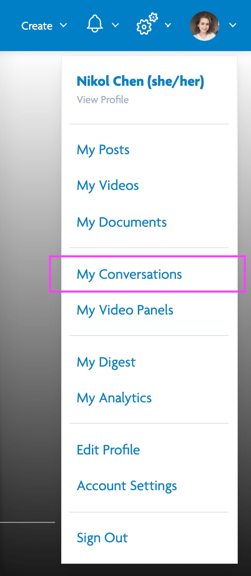 To go to the Conversations page you can either click on the link from the notifications email, click the link from the notification bell, or go to 'My Conversations' in the top right;