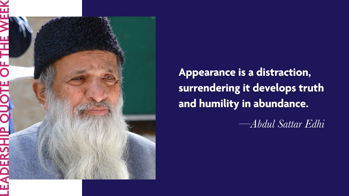 In his quote, Edhi notes that we are often distracted by appearances and how we present ourselves outwardly. This is particularly prevalent today, where we constantly present ourselves on social media. However, Edhi highlights the importance of developing one's inner values and character, which are fluid and can be moulded with effort. In particular, he underlines the importance of humility. We can see this in Edhi's own life and his humble lifestyle, despite his revolutionary work: he led from behind.