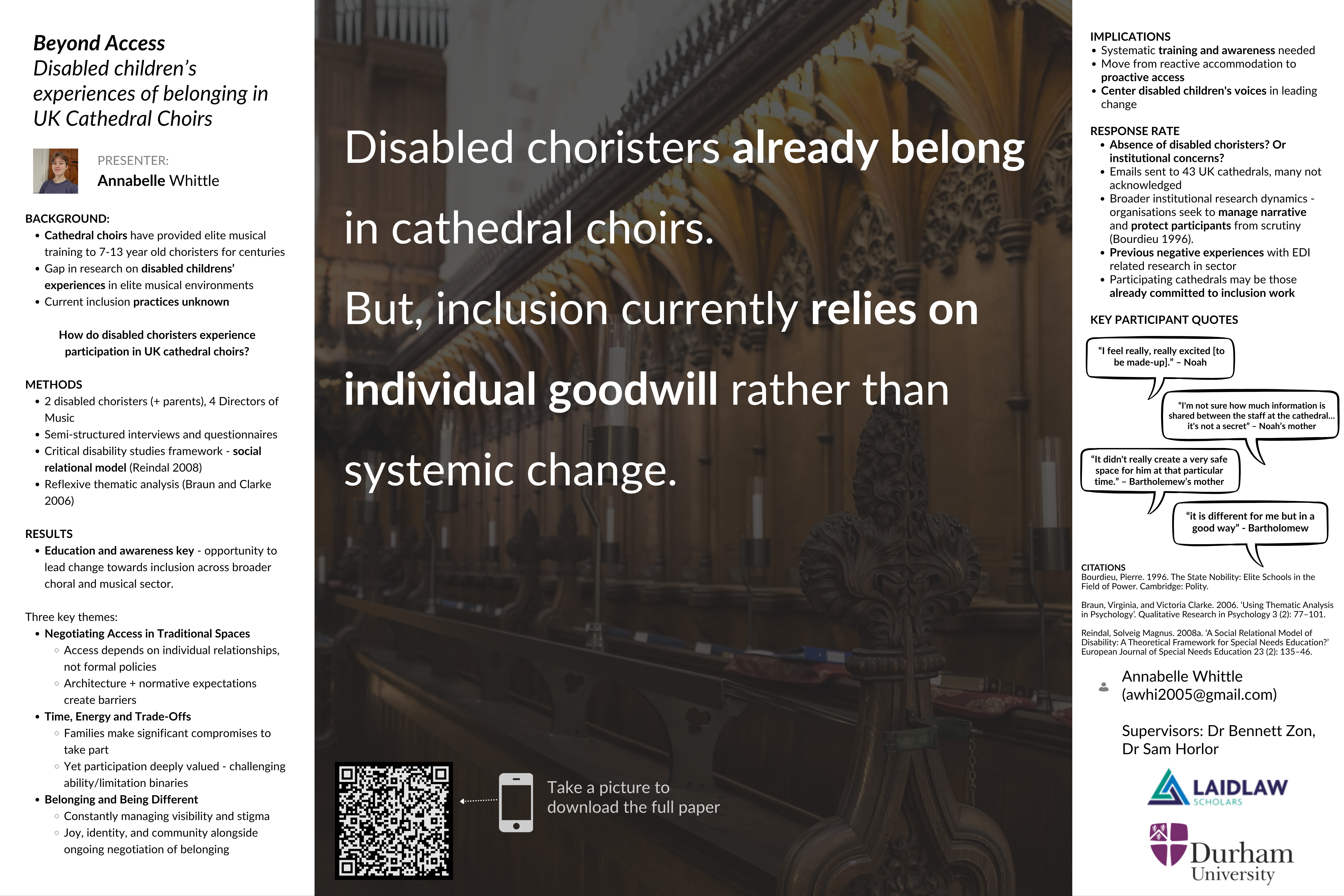 Poster for my report Beyond Access: Disabled Children's Experiences of Belonging in UK Cathedral Choirs. TLDR: Disabled choristers already belong in cathedral choirs. But, inclusion currently relies on individual goodwill rather than systemic change.