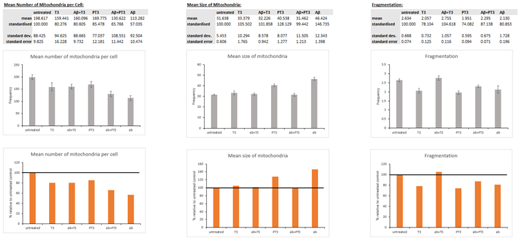 Across the three stressor variables of my project, I had over 1,100 cells to analyse; therefore, from this list of data points, there was no apparent relationship between them. Consequently, I created 30 bar graphs which presented the breakdown for the frequency of each condition for each stressor and bar graphs of the percentage of each condition relative to the untreated cells (control). This was useful as it provided a convenient way to compare my datasets and an overview of what I was working with. Then, I used GraphPad PRISM 5 software to create the scatter graphs for my research paper, and conduct the Analysis of variance (ANOVA) data examination of the mitochondrial morphology.