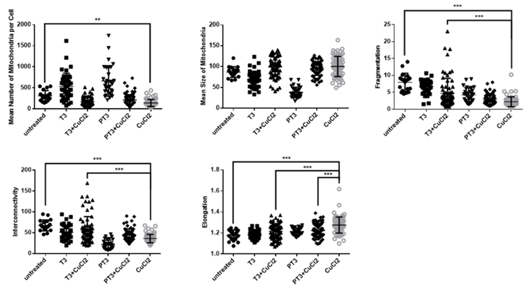As SH-SY5Y and HT-22 cells are highly active, they are sensitive to alterations in mitochondrial dynamics, and this was highlighted in the graphs and statistical analysis. As expected, the stressors alter the mitochondrial morphology in all areas examined- mean number, mean size, fragmentation, interconnectivity, and elongation. Interestingly, they had different effects on these variables. For instance, all the stressors decreased the mean number of mitochondria per cell. However, the homocysteine and copper increased the fragmentation, whereas the amyloid-β decreased it. Conducting further research to explore how and why these differences occur would be interesting.