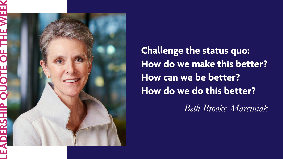 As we reflect on Beth Brooke-Marciniak’s quote, consider how you can apply her wisdom to your own life and work. Ask yourself how you can challenge the status quo in your personal and professional spheres. In doing so, you embrace a leadership style that is dynamic, inclusive, and constantly evolving for the better.