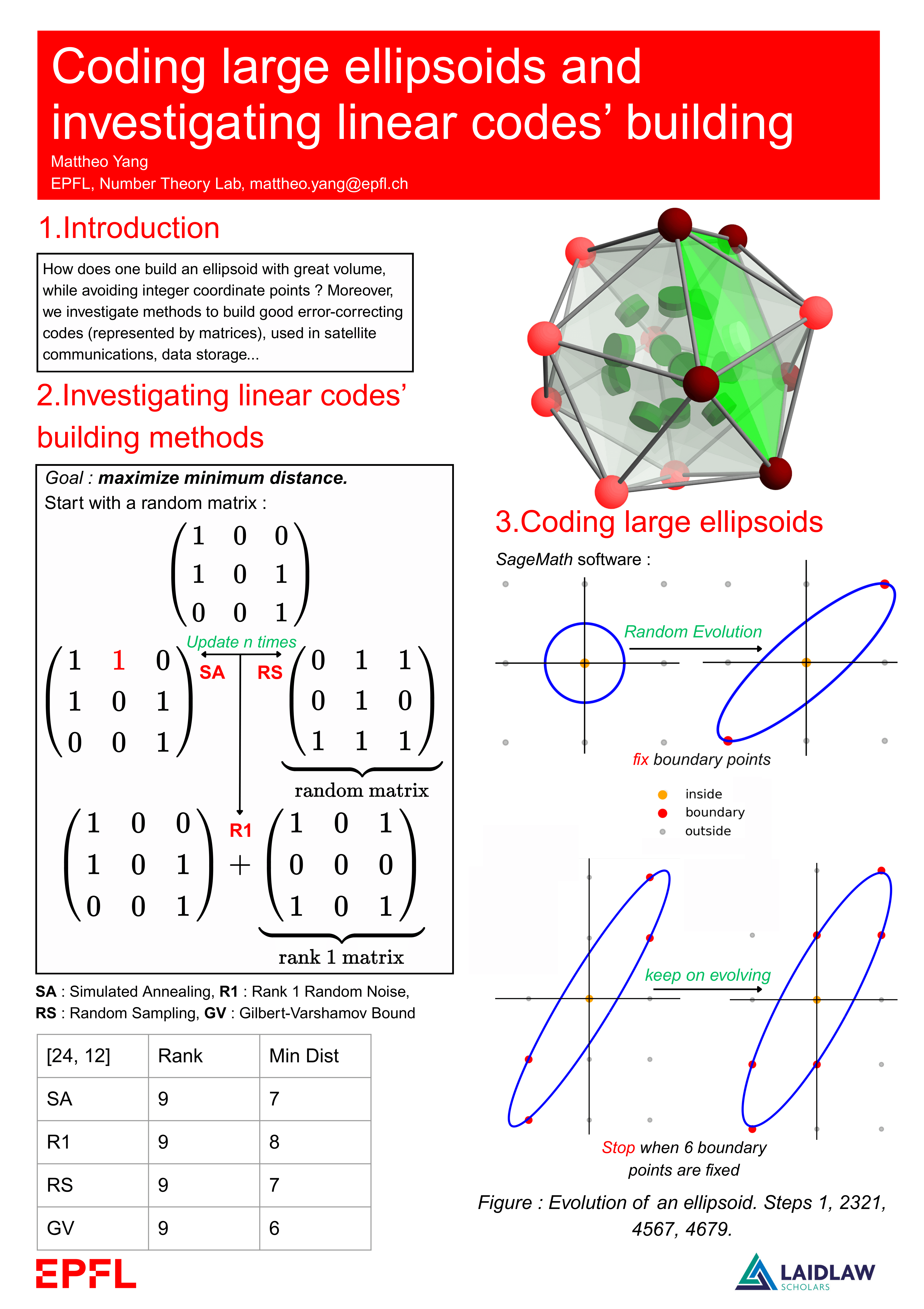 My research in the Number Theory lab this summer was linked to two things. First, the problem of sphere packing, and secondly the question of finding a method to build linear codes with good properties. I will soon publish my report so stay tuned !