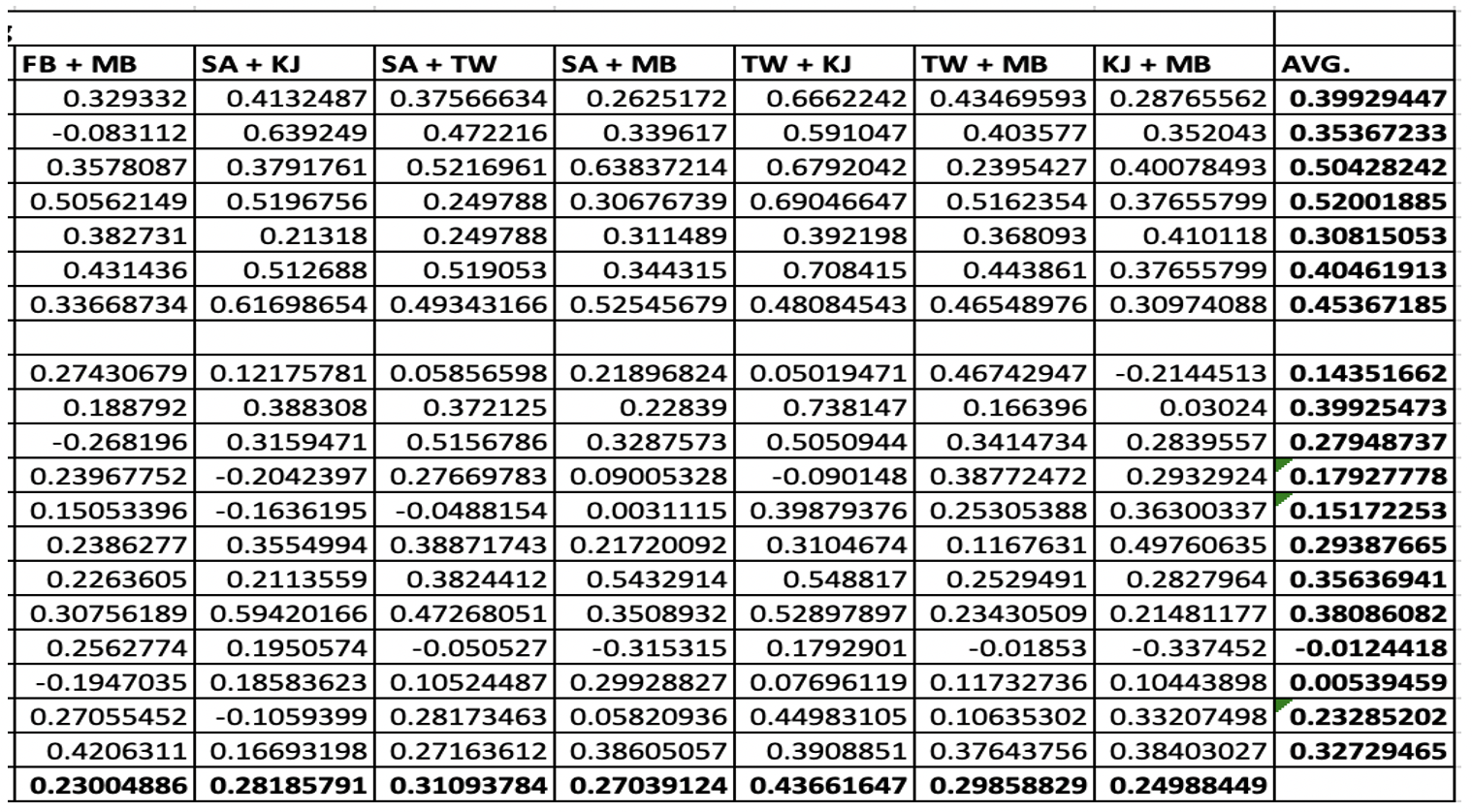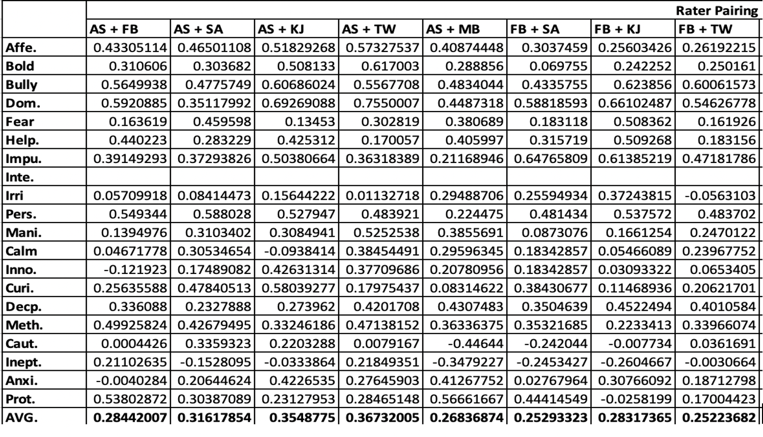 Analyzing the data began with calculating R^2, the coefficient of determination between each pair of raters for every personality trait. Calculating this measure allows for an understanding of how similar the ratings are per chimp for each set of raters. This measure was important to calculate to determine if any adjectives resulted in very mixed ratings, or if any raters were seemingly unreliable compared to their counterparts across all the ratings. To calculate R^2 using excel, the data needed to be sorted into columns of two by chimp ID for each pair of raters. Because Versions A and B were organized in opposite fashions, sorting this data by eye was time consuming. While the first three raters’ data was collected using Version A and so could be compared seamlessly, the last three raters needed to be reorganized to fit each rater of Version A. Once this step had been completed, the correlation could be calculated for each pair.