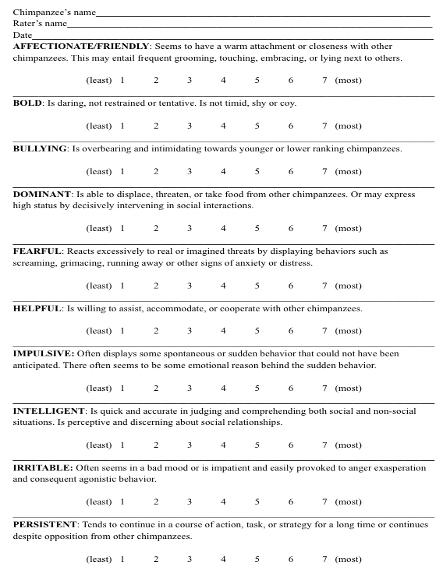 - This questionnaire was completed by each of six raters for all the 66 chimpanzees that they were familiar with.