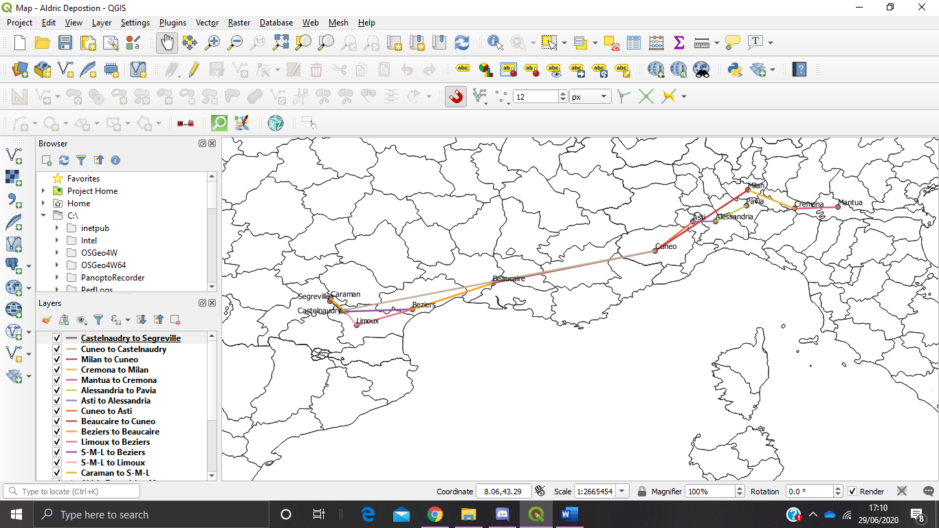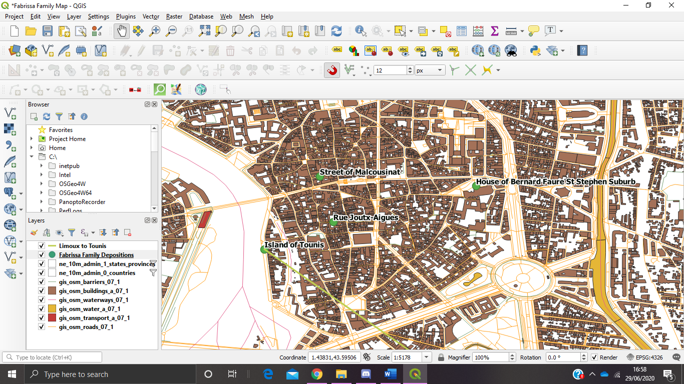 My research is focused on mapping places mentioned in the inquisition records as a different way of presenting data. Rather than just vague mentions of this happening here, or this activity happening there – being able to see the data and activities being presented in a very visual way can help to develop alternative interpretations and ideas about what is going on and who is doing things. Last summer and the start of this summer, the data was being presented purely on maps. Last summer I was almost entirely focused on mapping people’s movements, which helped me see the way the deposed dissidents were working when fugitives, such as being heavily itinerant, staying at houses of people in both the Languedoc and Italy (Figure 1).