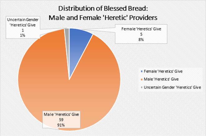 One straightforward exchange was heretication for the ill or dying performed by the ‘heretic’ in return for money. This one came up often and appeared to be quite a clear exchange. However, there were often actions such as supporters providing food and wine, or clothes, and heretics performing actions of ‘blessed bread’, which are a bit less clear. This offered potential for analysis via mapping, but also through data analysis, creating charts that help compare different actions and ratio of genders (Figure 3). This was an expansion and new direction to what I had been doing previously that came up unexpectedly and was a departure from what I thought I was going to be looking at. But that didn’t make it a bad thing – it was still within the scope of my research, and actually provided more structure and more room for concrete ideas and results to jump out at me. I was able to engage with the material in a much more rooted and grounded way that enabled experimentation in my data presentation – trying out the ways of presenting this in the mapping form and in the chart form.