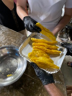 Making snacks with a group of snack makers: On Wednesday, we went to a snack-making unit; I was also really excited for this experience. We got to see and try out lots of the stages in snack making, such as a sweet, crispy snack called Maddaku. The snack-making gave me a sense of pride due to the confidence I felt when completing the steps. Kanagi, Shyamala and Santha would show us what to do and only give minimal guidance after that. Previously, I would have been very worried about failing and imperfection, but I actually felt comfortable doing it, even if they were not the best examples of Maddaku! I felt very encouraged by the women, so when they told me to make a change, I did not see it as a mark of failure but a positive adjustment.