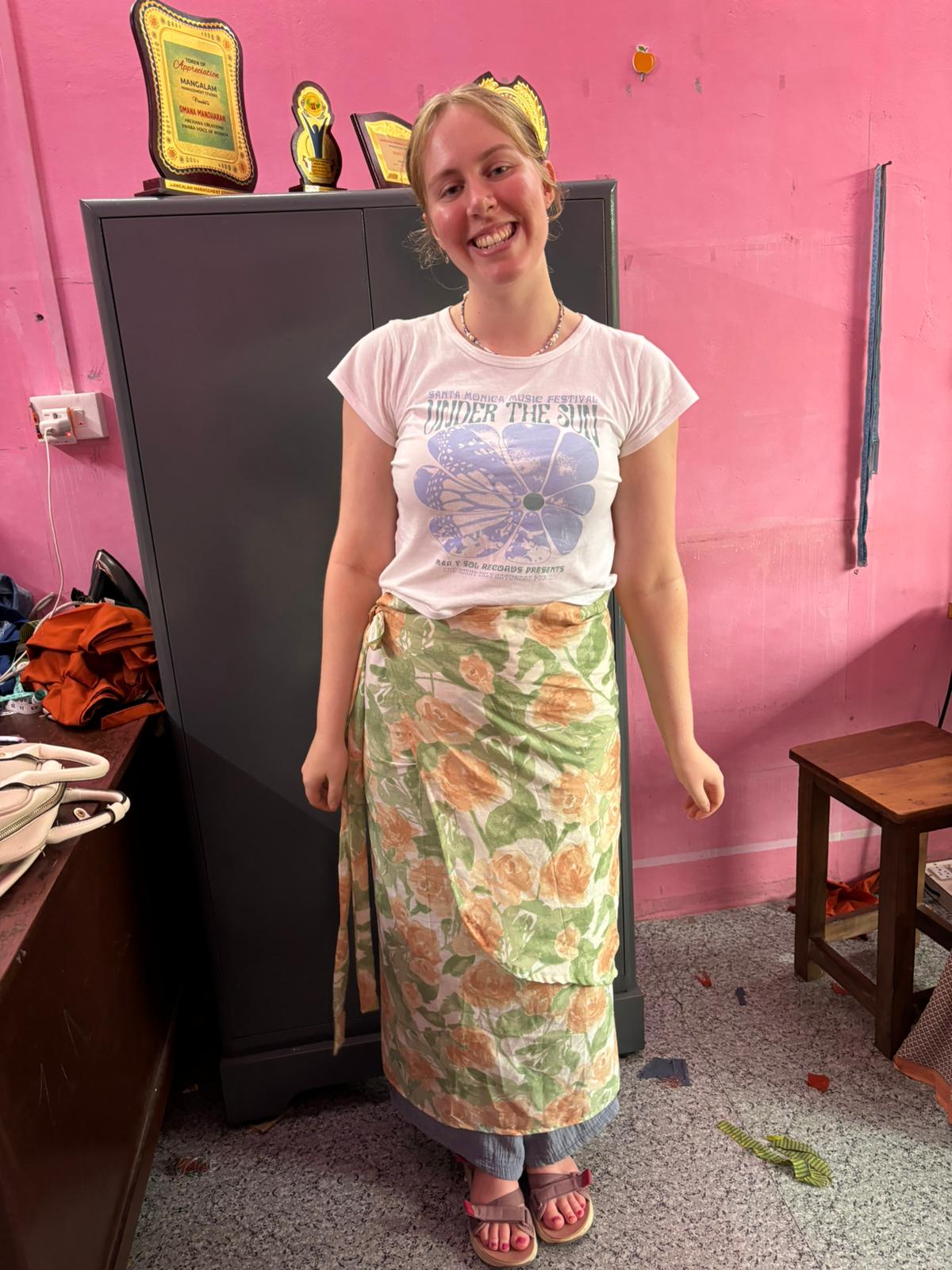 Although I had done a (slightly terrible) drawing of my design, for some reason I had thought that the tailors would immediately know what I meant or what was going on in my head. I was very wrong (which is completely on me). With the language barrier and no experience in communicating a design, I had to be patient and quickly adapt my communication style, using reference images and clearer sentences to successfully get my idea of a wrap skirt across. I really enjoyed collaborating with my collection partner@Yoshino Homma , as her creativity and actual skill in drawing is fab. I am so grateful to the tailors for being patient and persevering with our designs, as everyone’s was crafted so beautifully and it was such an amazing opportunity to be creative! I felt so energised and uplifted after working with Asha and honestly she is such a role model for young women.