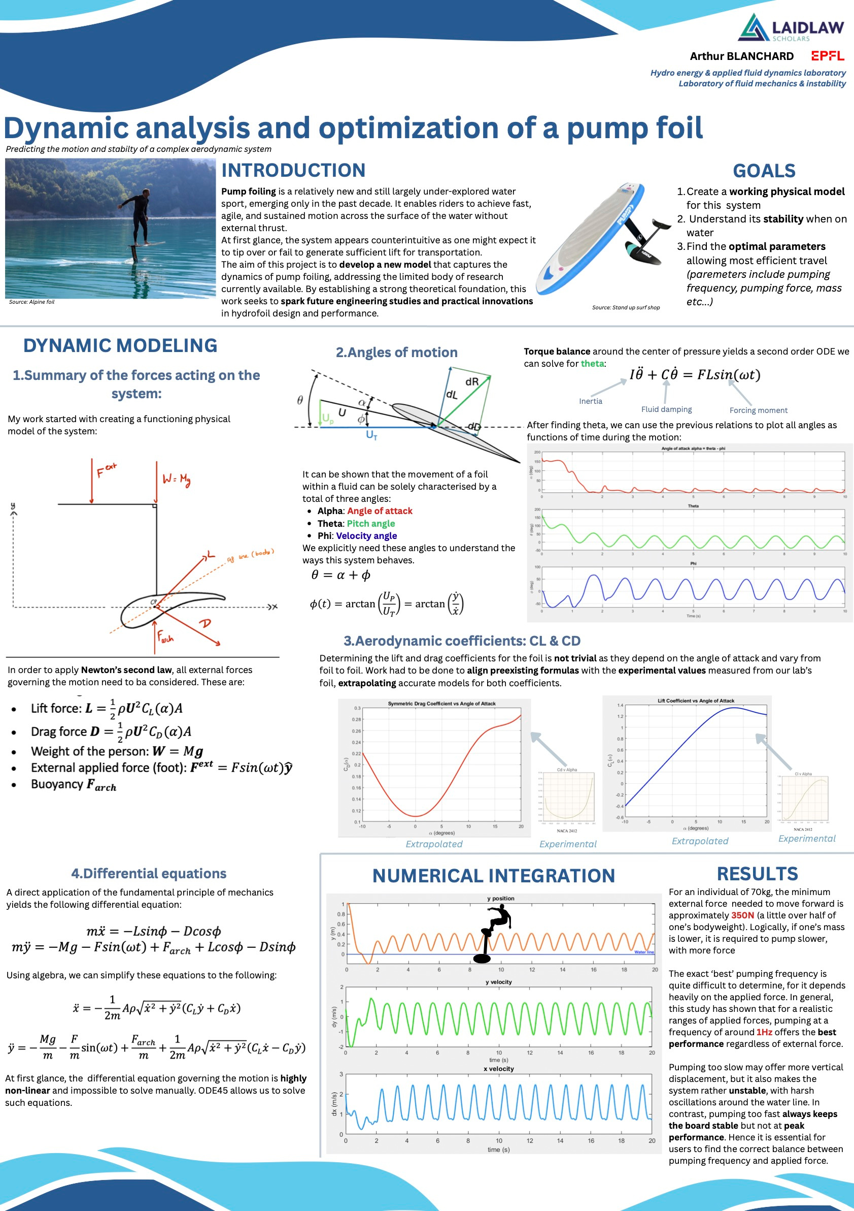This summer, I had the pleasure to work at two EPFL labs: the Hydro Energy and Applied Fluid Dynamics Laboratory, and the Laboratory of Fluid Mechanics and Instability. My project: understanding the dynamics of a pump foil, creating a new working physical model for it, and finding the optimal parameters (pumping frequency and applied force) for most efficient performance. Attached is my poster, feel free to reach out if you have any questions I would love to tell you more!
