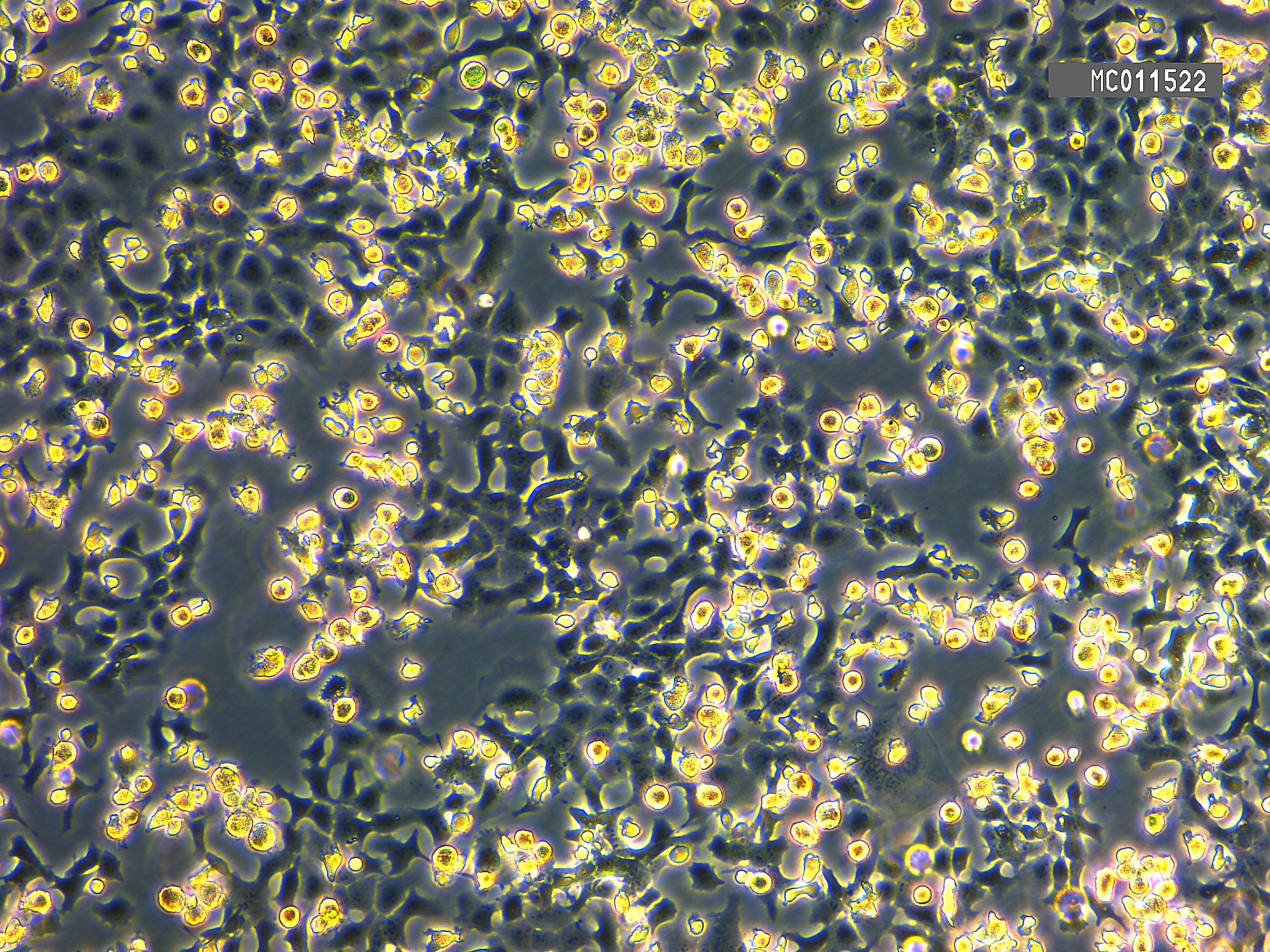 - This is an image taken from a microscope of the two different cells types I worked with. In this experiment, the cells were grown together in order to mimic the environment of the alveoli.