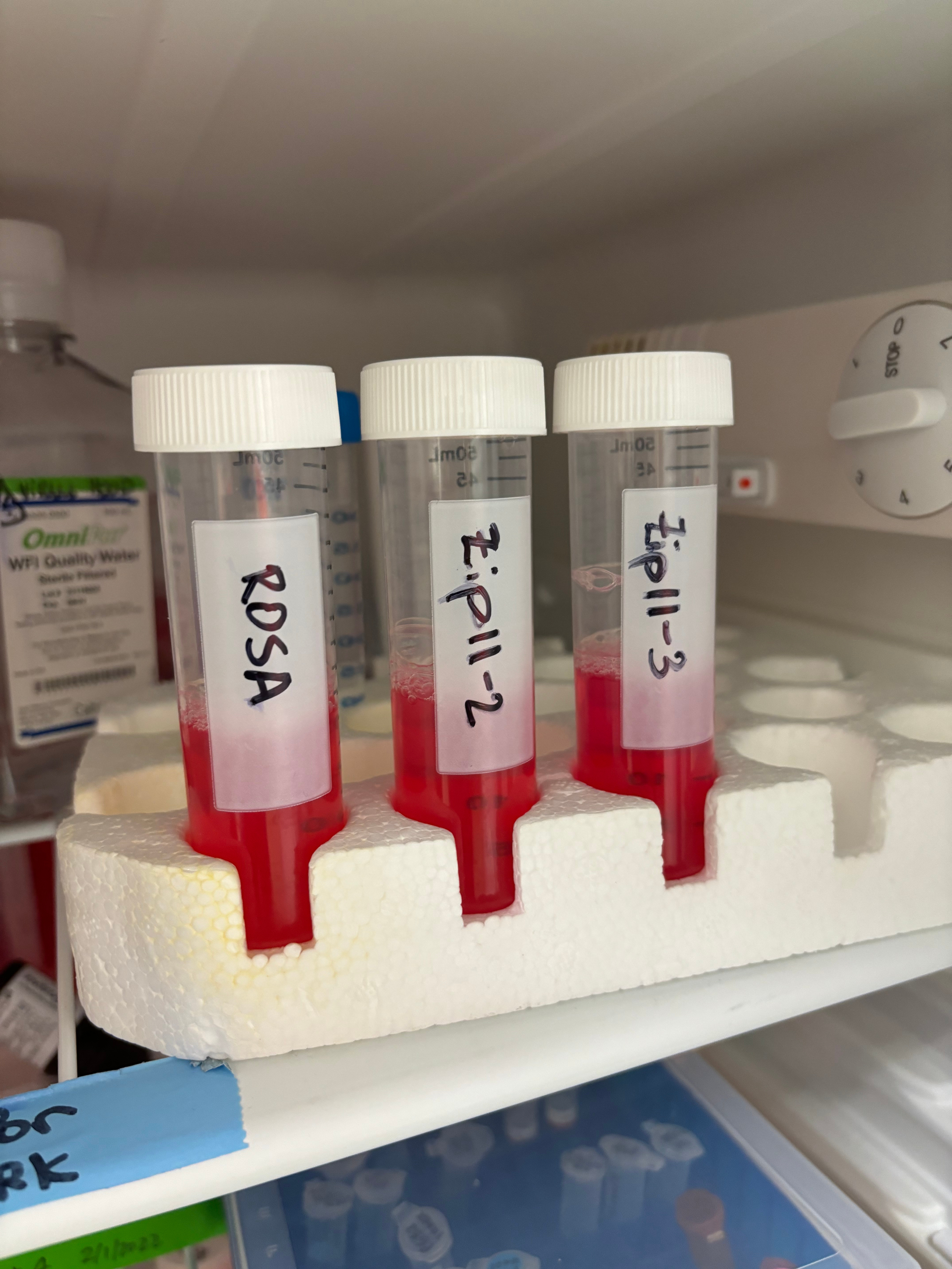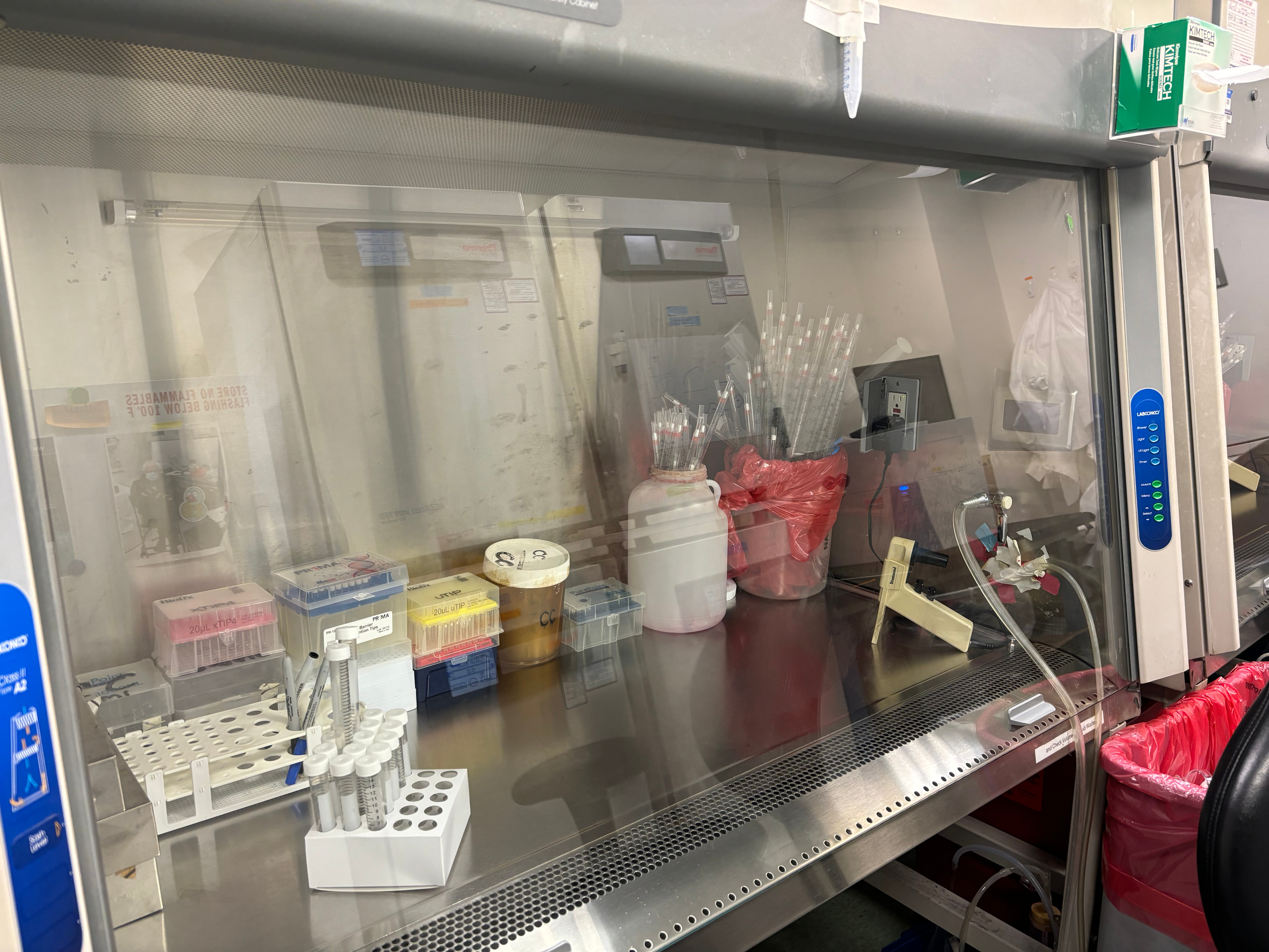 Much of the work of my project up until this point has been developing a cell line that lacks the ZIP11 transporter protein (knockout or KD cell line). Since that requires working with cells, all the work has to be done in a sterile environment, which is pictured above on the left. Initially, learning how to work in the hood so that proper sterility was challenging, since you want to work efficiently but also not be sloppy. However, I believe that I now have a solid foundation in tissue culture work ranging from bacteria, mouse cells, human cells, and virus thanks to my mentors in the lab and will be able to utilize those skills going forward. On the right is the virus media that I transected with the plasmid that I designed. Today, I plan to concentrate this media (and the virus) and then infect cells in order to knockdown the ZIP11 protein in vitro.