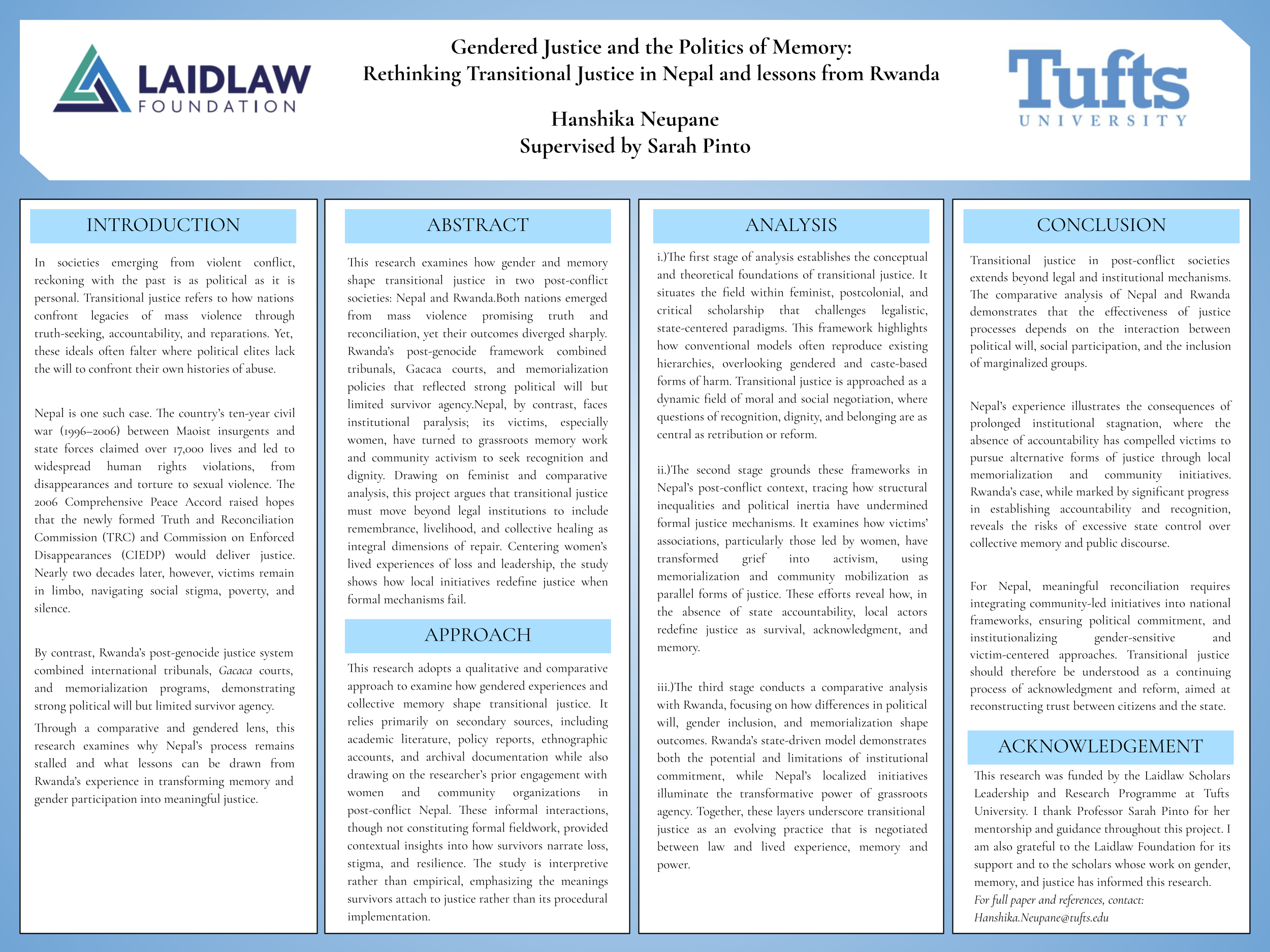 Gendered Justice and the Politics of Memory, examines how women’s lived experiences in Nepal and Rwanda reshape what justice means after conflict. It highlights how survivors transform grief into activism through memory and community work, showing that justice must extend beyond legal mechanisms to include dignity, livelihood, and recognition.