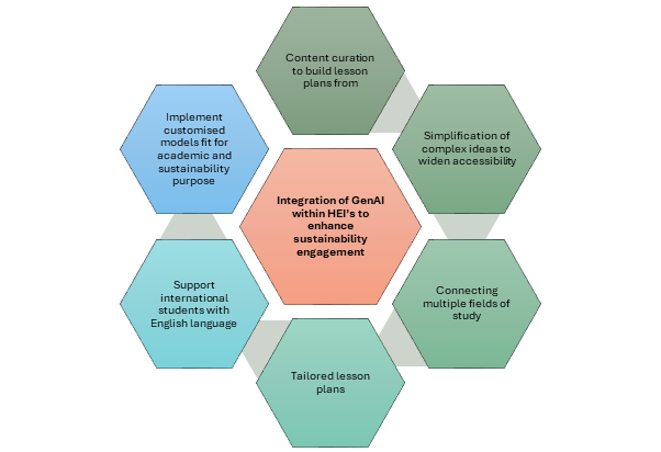 While knowledge and capabilities of GenAI have been advancing rapidly, in the meantime we have reached a critical tipping point in the climate change trajectory. With a rising human population and increasing threat to natural resources due to human activity, we face a “battle for our lives” (UN Secretary-General António Guterres). Tackling this challenge requires coordinated global action across all sectors. Higher education institutions (HEI’s) are uniquely situated in this battle, with their potential to deliver sustainability education and empower students to lead the transformations needed for a sustainable future.