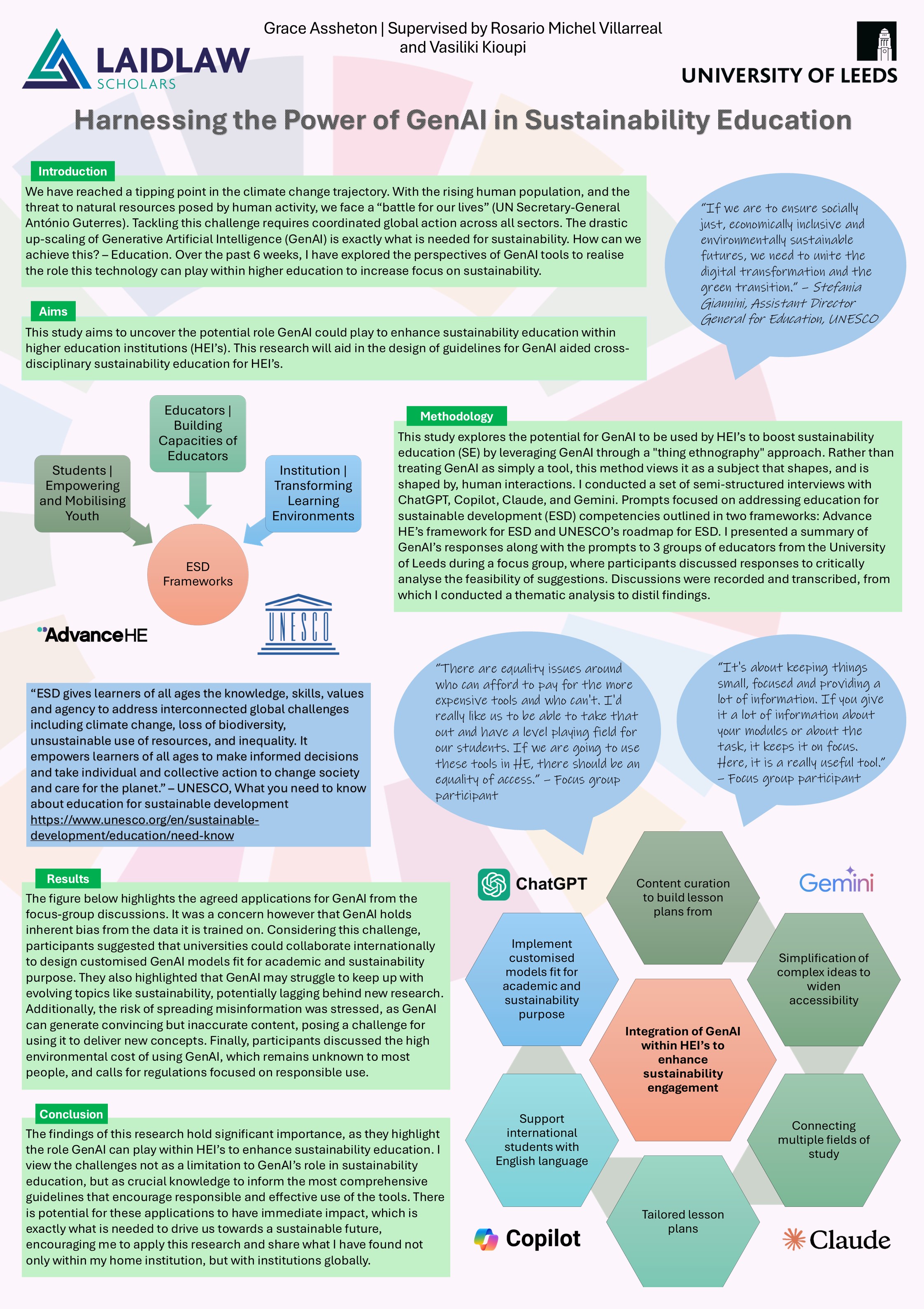 Here is my research poster outlining my summer research project exploring the potential implementation of GenAI tools to enhance sustainability education in higher education institutions.