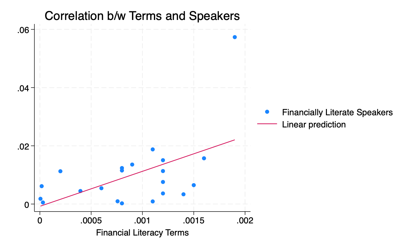 After constructing a simple linear regression that correlates the presence of financial literacy terms with the financial literacy outcomes of speakers from different Indian language groups, I was able to find evidence of a correlation.