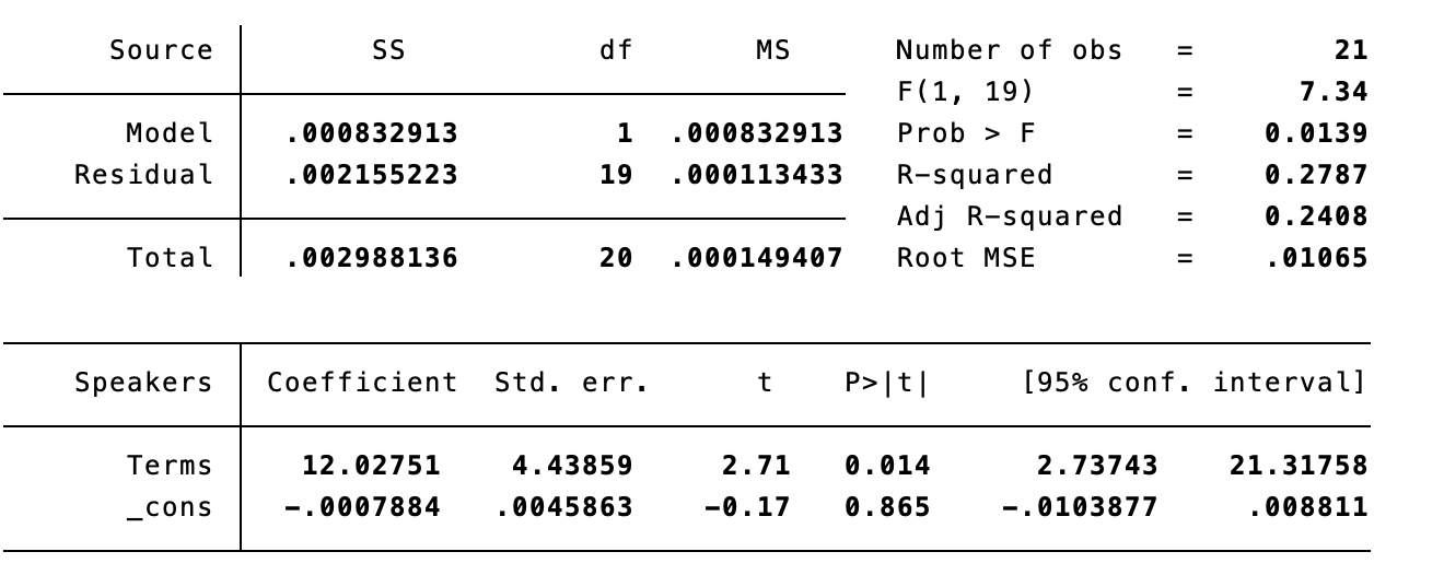 As shown in Figure B, the dependent variable "Terms" is statistically significant (0.014 < 0.05), and the R-squared value is above 0.1. In human behavior research, this correlation is considered acceptable.