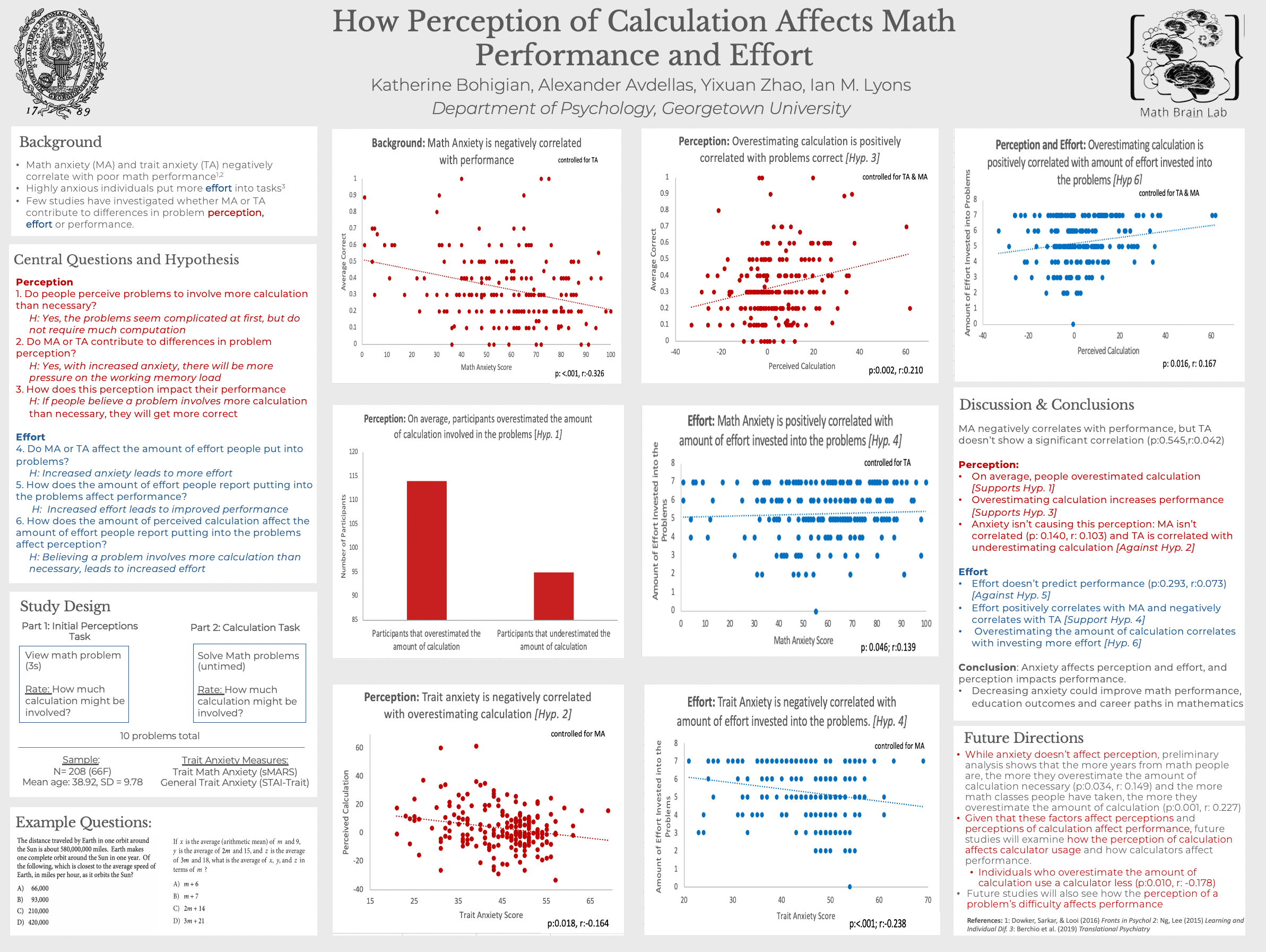 For my project, I worked under Professor Ian Lyons in the Math Brain Lab in Georgetown's Department of Psychology. My project focused on how people's perception of the amount of calculation a problem involves affects their math performance and the number of effort they put into the problems.
