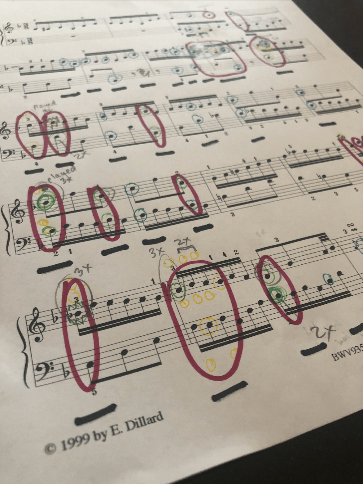 I found myself devising over-complicated coding mechanisms that left me staring at my data for hours upon hours, only to have a meeting with my supervisor and realize that these methods were incredibly and unnecessarily complex. What you see in the photographs represents the biggest challenge in my research so far, which is having to restart my entire data analysis (hence all of the chaotic scribbles you can see on the sheet music).