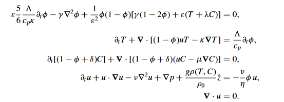 The equations may look rightfully daunting but can be explained very simply. From top-downwards: (1) controls the evolution of phase, that is, how the ice layer varies, (2) describes the evolution of temperature in the system, (3) controls the evolution of salt concentration in the fluid, (4) controls the movement of the fluid itself, (5) imposes the condition that density does not generally vary.