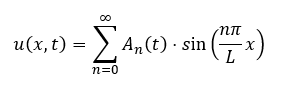 Where u is the wave amplitude, t is time, x is distance, and alpha is the wave speed. For this method, we assume that the solution to u is given as an infinite sum of orthogonal sinusoids.
