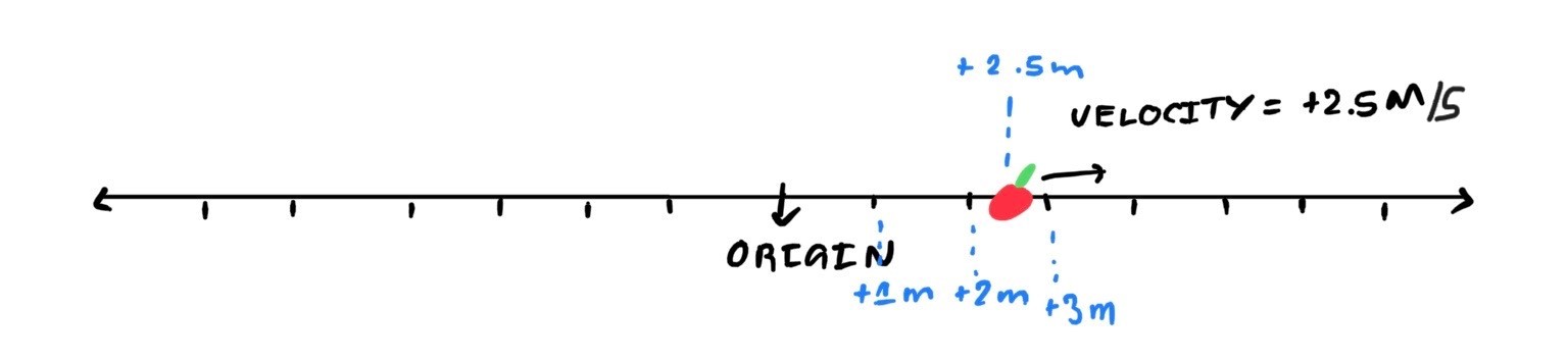 For example, if the apple is +10 metres from the origin, its velocity is +10 m/s (moving to the right). If the apple is at the origin, it does not move. If the apple is -12.5 meters from the origin, its velocity is -12.5 m/s (moving to the left).