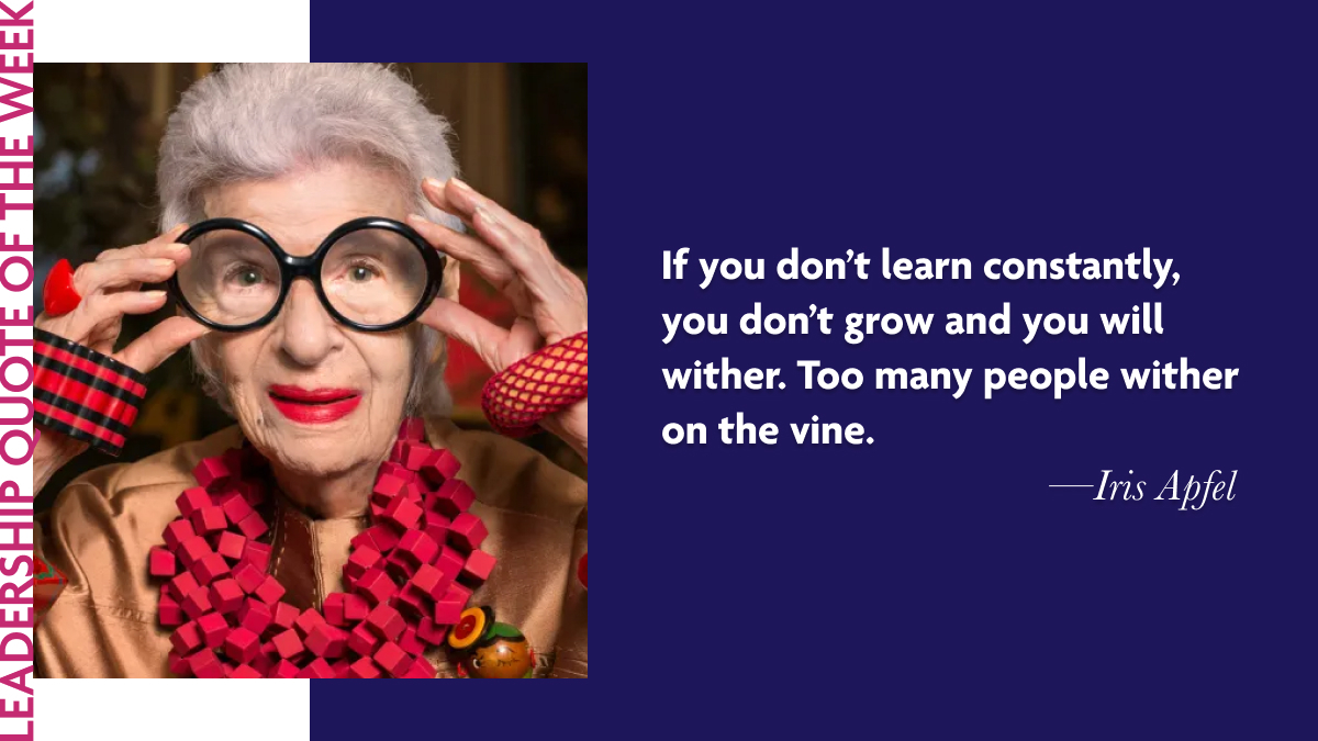 This week for our leadership quote, we pay tribute to the remarkable Iris Apfel, an iconic figure in the worlds of fashion, business, and interior design, who passed away recently. Iris was not just known for her unique and vibrant style but also her wisdom and wit, leaving us with many memorable quotes that resonate far beyond the realms of design and fashion. One such pearl of wisdom encapsulates the essence of lifelong learning and growth: