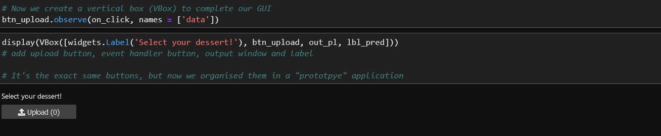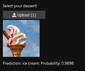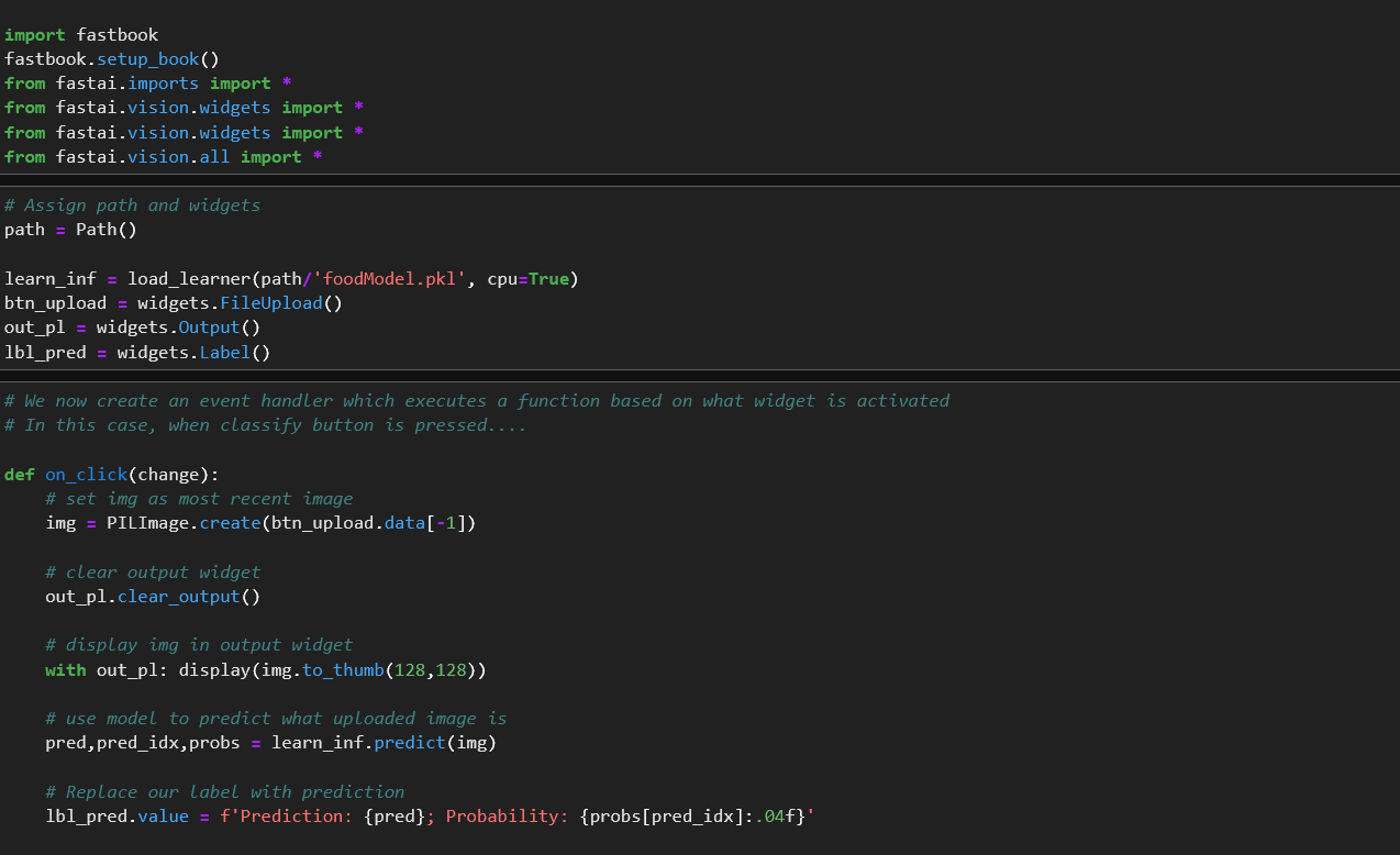 To simplify what's happening here, I'm loading a trained model (created in a separate notebook) that knows the difference between pizza, ice cream and cookies. Using that, I created an upload button which when given an image, runs the model and outputs a result with a confidence rating between 0 and 1. Despite the simplicity, it really helped to solidify the foundations of deep learning in my head.