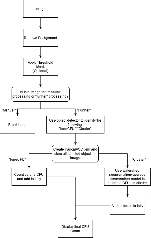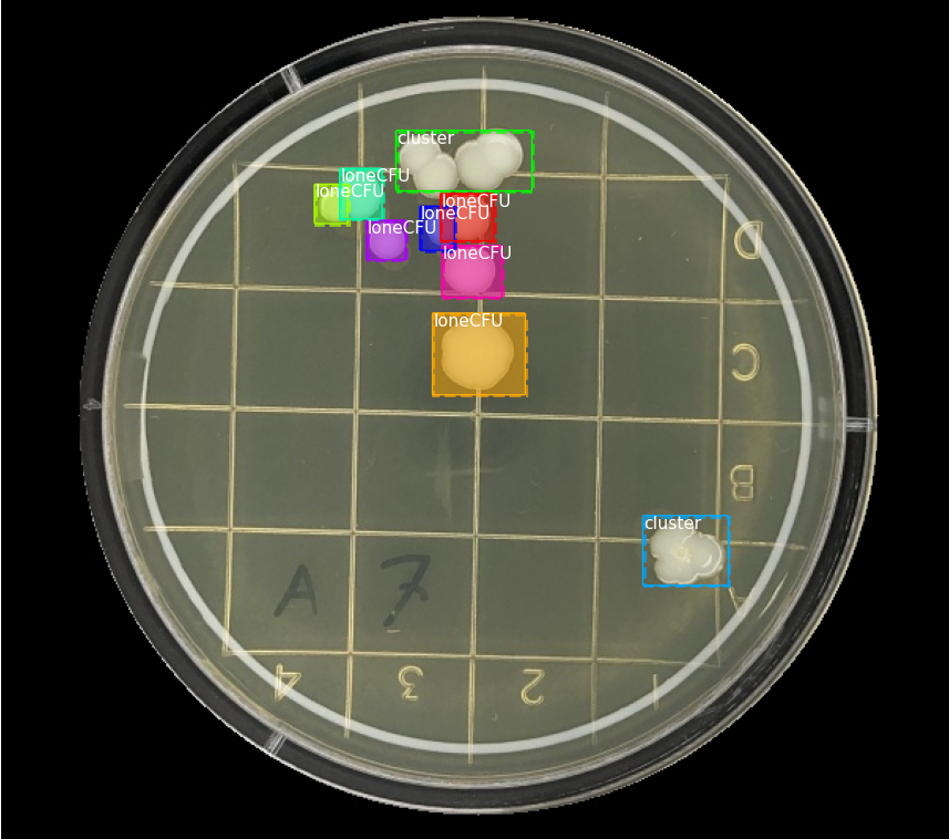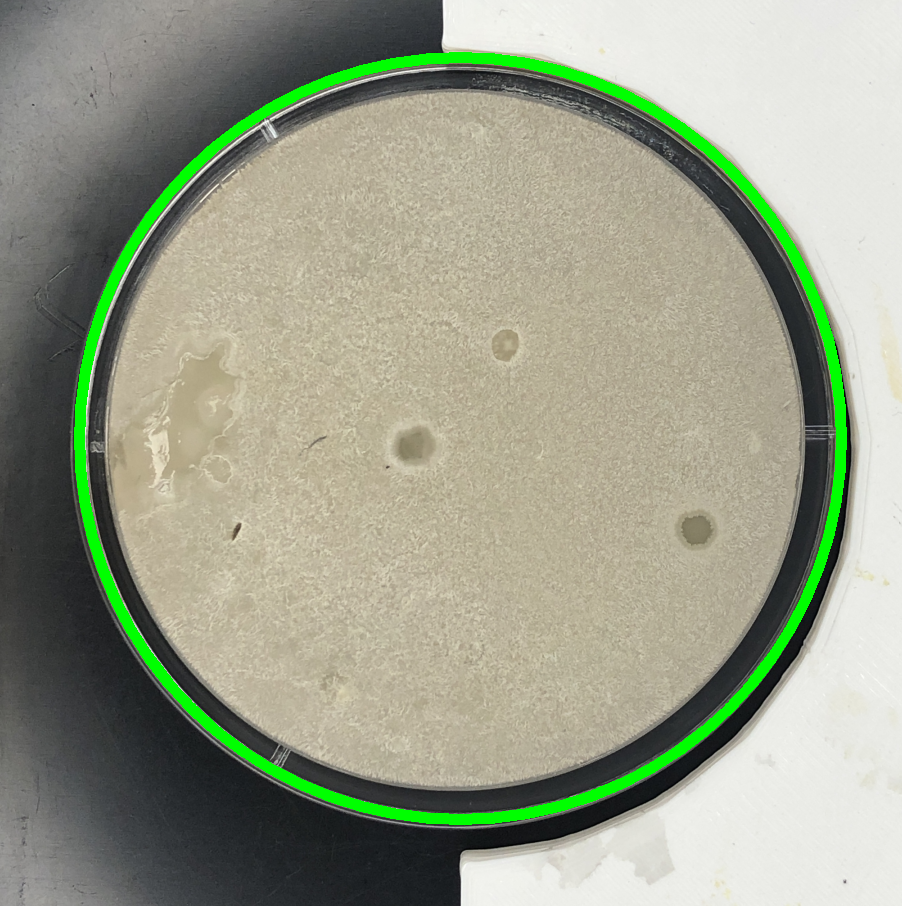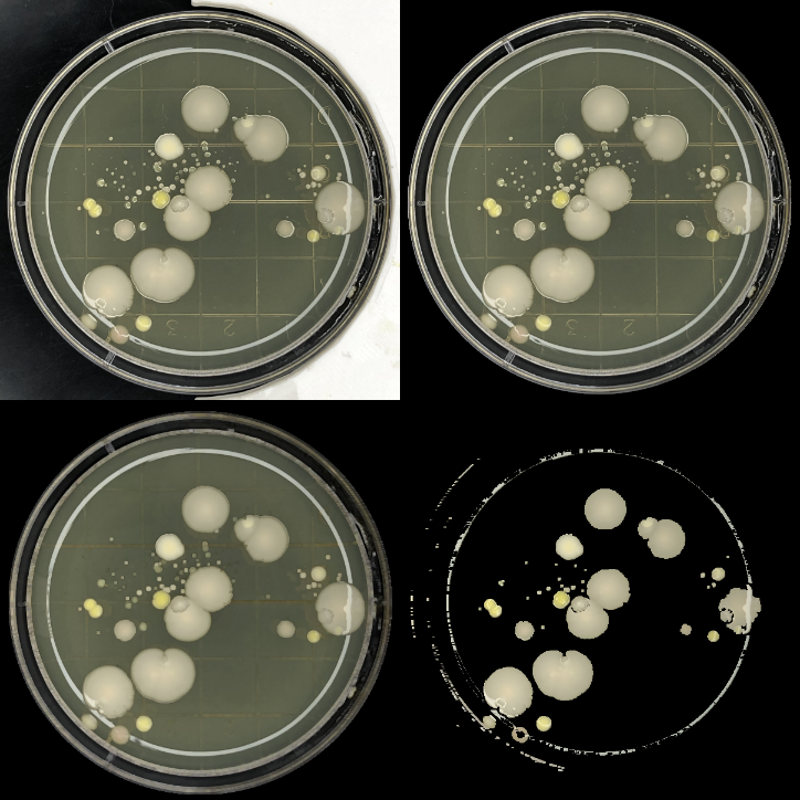 I also tried fixing up the contact plate, blurring any drawn lines that were present in the image. However, I discovered that there was data being lost due to the blurring algorithm. Notice how the smaller CFUs are being lost after processing.