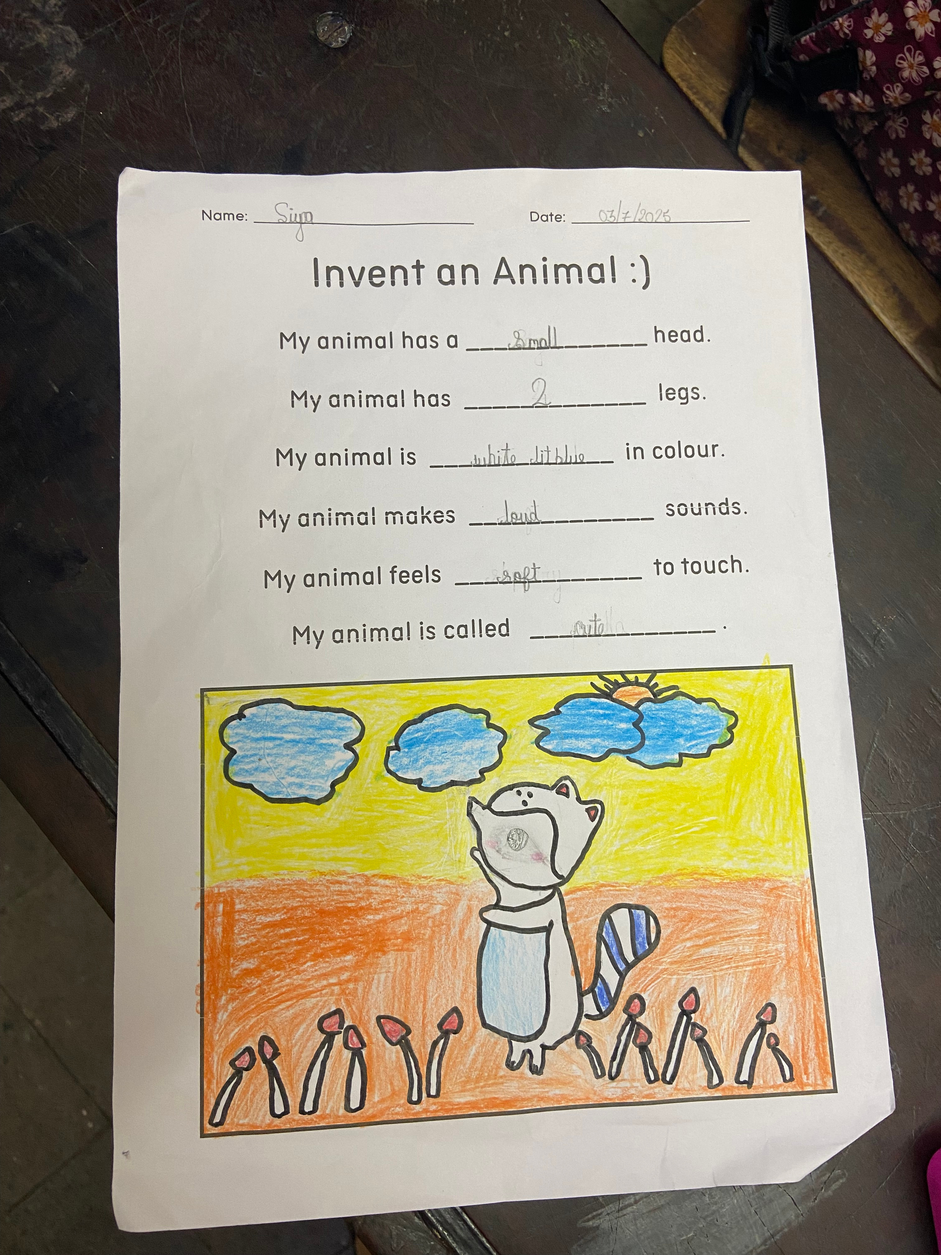 For instance, on one occasion, an art teacher visited the class and provided the prompt, “Draw what love looks like to you.” The aim was to encourage the students to think creatively and depict something original and imaginative — ideally, something they had never seen before. However, the children initially struggled and many defaulted to drawing familiar figures, such as their favourite characters, family members, or favourite foods. After we rephrased and clarified the instructions, some students began to grasp the task more fully, which was then reflected in their artwork. One child, for instance, drew a samosa-shaped mountain, while a few others imagined a rainy day with chocolates and sweet treats falling from the clouds. Reflecting on this challenge, we decided to use a different approach later in the week which turned out to be more effective: we asked the students to invent their own animal using a list of sentence starters and fill-in-the-blank statements—this guidance made it much easier for the children to be creative and use their imagination.