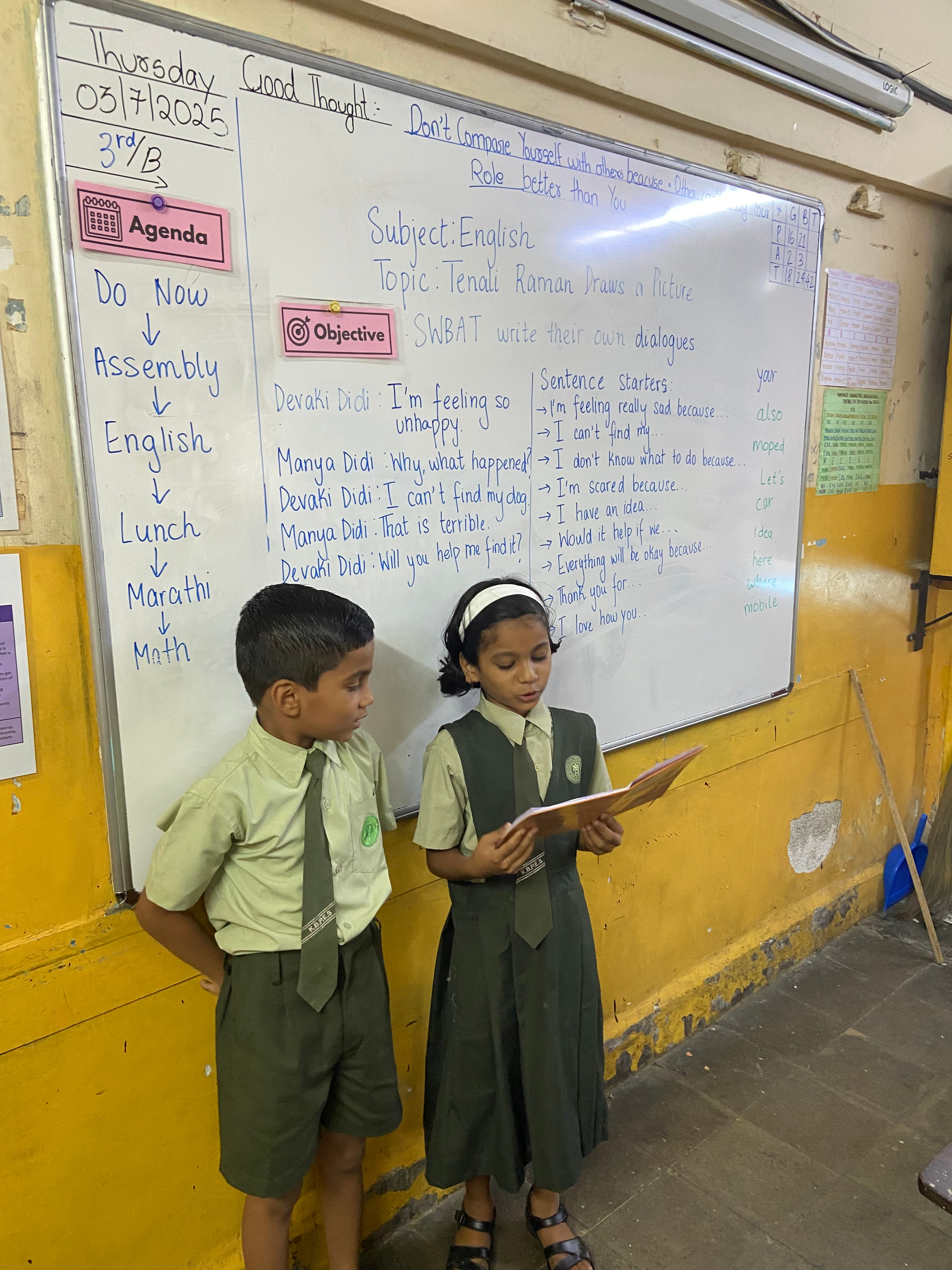 Before beginning my 6 weeks as a teaching assistant in Classroom 3B, I had an hour-long chat with the class teacher, Devaki, who was completing a 2-year teaching fellowship. I learnt that the students at the school came from low-income backgrounds, with many facing violence and abuse in their home environments. Student absences were frequent at the school since many faced difficult circumstances back home. For instance, one of the students in Classroom 3B was often away for extended periods—sometimes months at a time—due to an unstable and abusive home environment. As a result, his education had been severely disrupted and there were large gaps in his knowledge compared to the other students. At the school, parents paid a tuition fee of ₹1400 a month (approximately £12), which was locally considered a significant expense. Most of the children in Devaki’s classroom were fluent in Marathi and Hindi, and had just started to learn English at school about a year ago. She informed me that although the children had made a lot of progress over the course of the previous year, their English would be rustier than usual since they had just come back from a month-long break and had not spoken in English all summer.