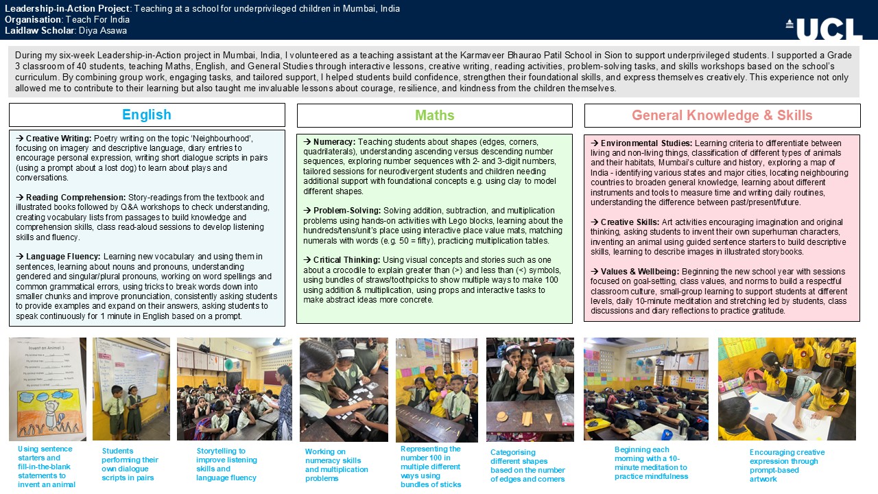 I would like to thank the organisation, Teach For India, for providing me with this opportunity to contribute to educational equity in India. I am deeply grateful to Devaki, who was an incredible mentor throughout my LiA experience and set a remarkable example for the children in the classroom—someone they genuinely trusted and looked up to. I have learnt so much from her and the children about resilience, patience, and courage—lessons that I aim to carry forward with me. Finally, I would like to thank the Laidlaw Foundation for providing the funding that made this rewarding experience possible, and my university coordinator, Christopher Cullen, for his invaluable guidance and support throughout the 2-year journey!