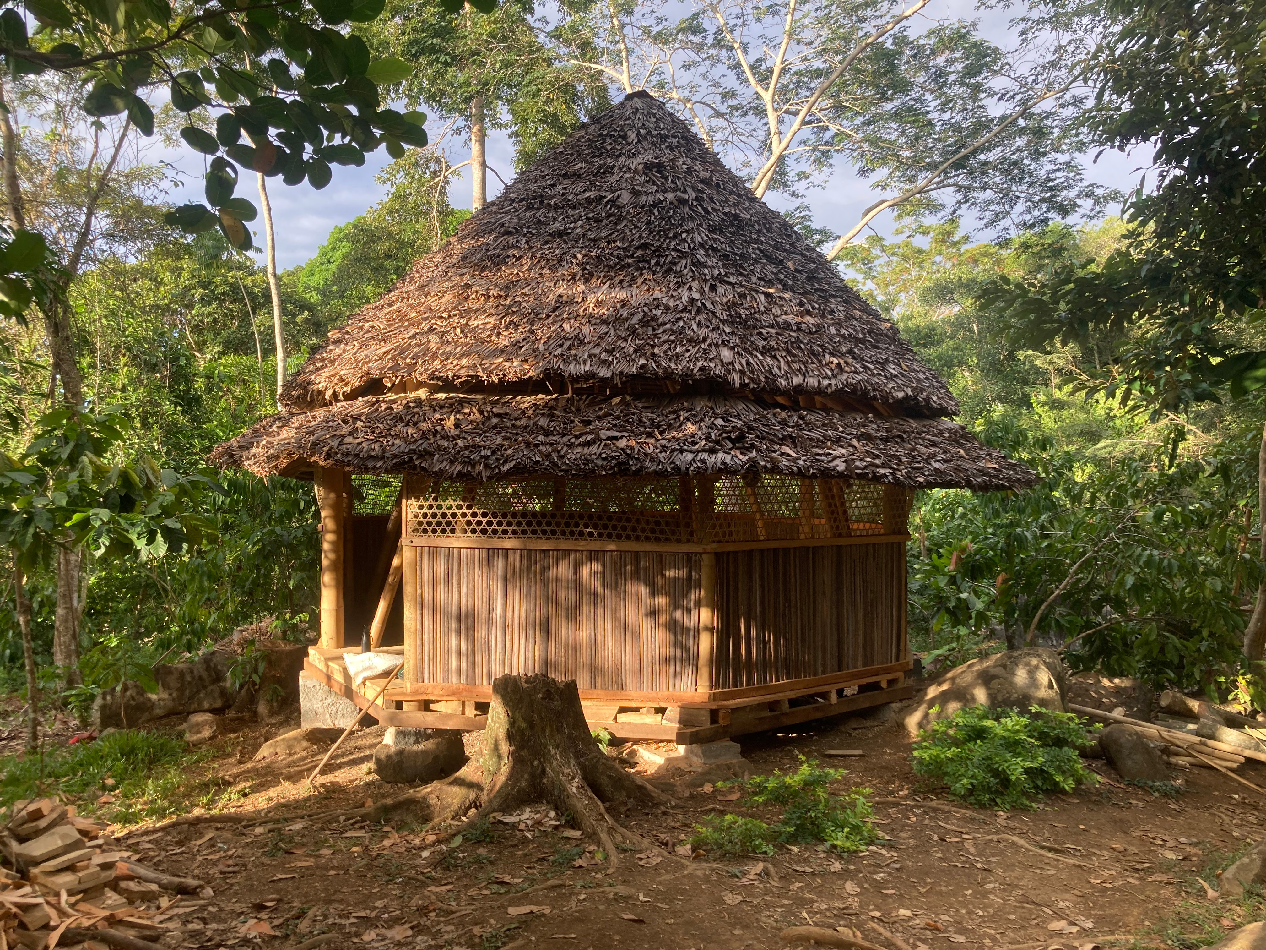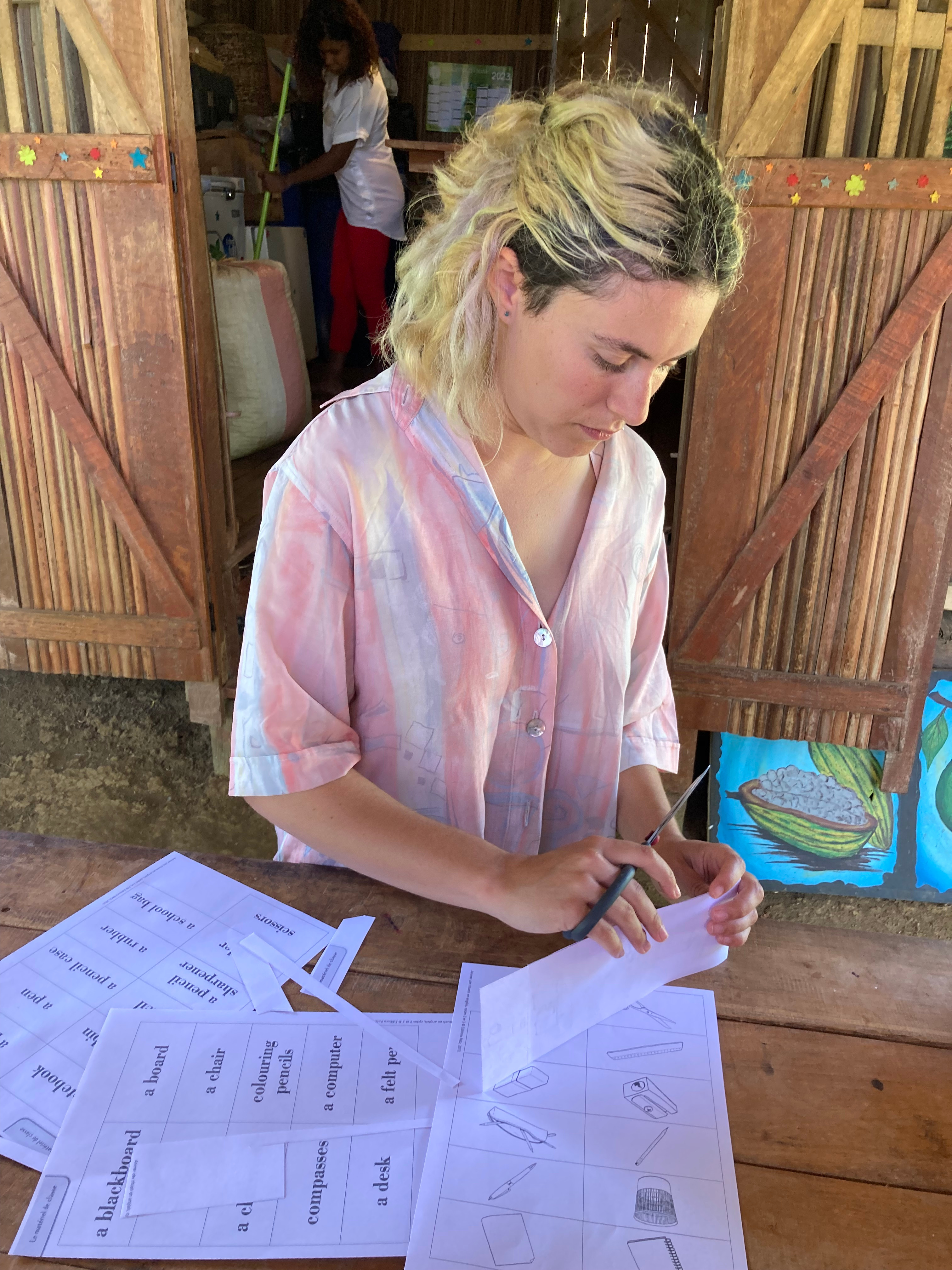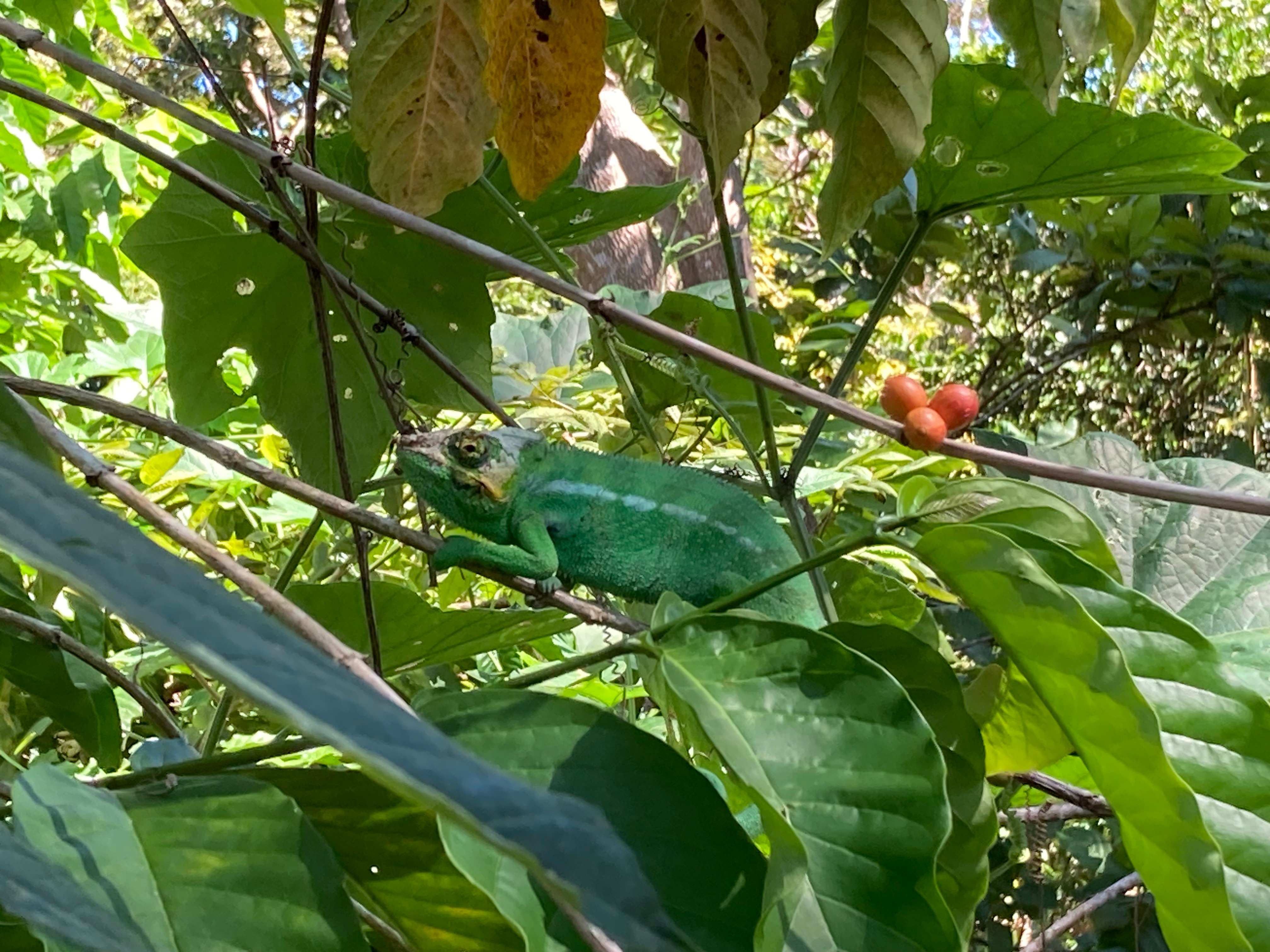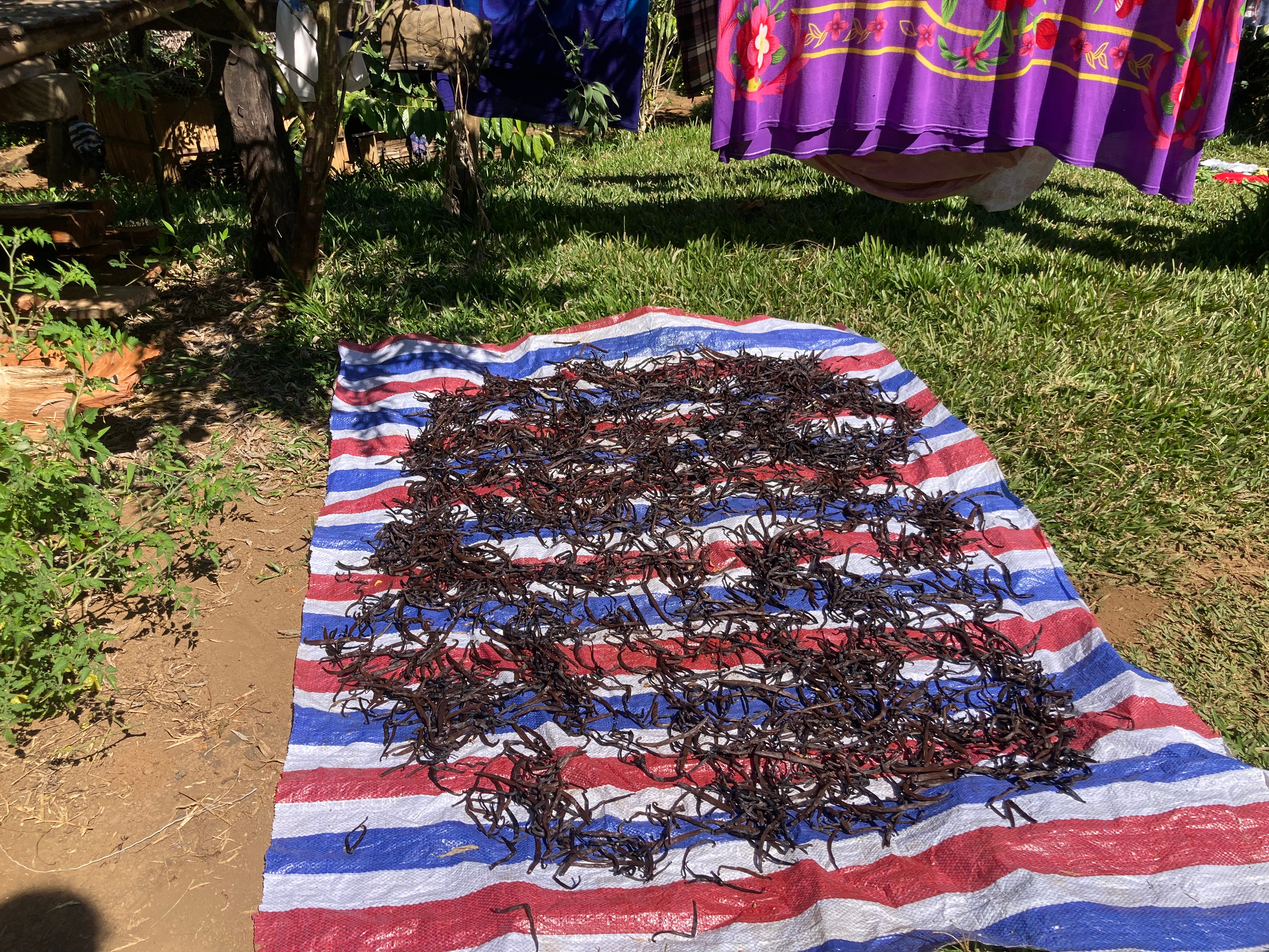 It took me a few days to find my bearings when I first arrived. Located in the middle of the forest at 500 meters above sea level, it takes an hour to trek up from the small seaside town of Ampangorinana, through dense forest populated by boas, chameleons, and lemurs, and past some rewarding views of the bay. At first, I was most interested in participating in the association’s agricultural projects, as I wanted to learn more about agroforestry. Agroforestry is an eco-friendly cultivation technique where crops are cultivated within the natural forest ecosystem, resulting in crop diversification, healthier soil, habitat protection, and more profitable and productive land use. Akiba produces a huge diversity of crops such as cacao, coffee beans, pepper, jackfruit, vanilla, pineapple, sugar cane, and combava using this method. In my first days, I helped harvest coffee beans, sorted drying vanilla pods, peeled and juiced sugar cane, and helped with other miscellaneous agricultural tasks.