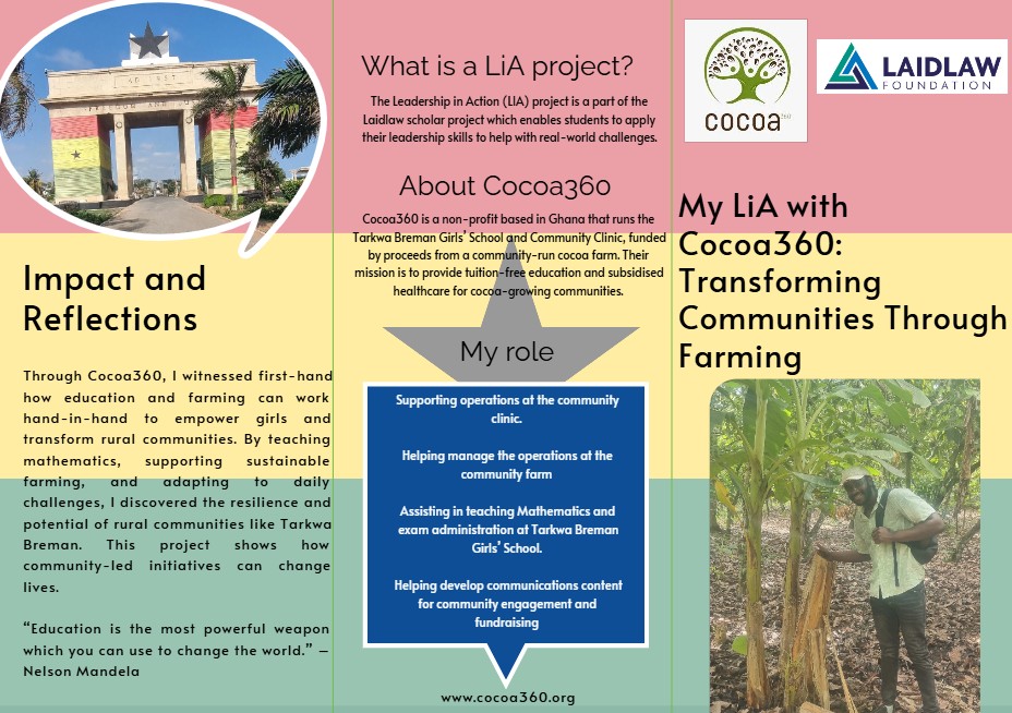 In 2025, I spent approximately four weeks in rural Ghana working with Cocoa360, an NGO whose mission is to leverage community-run cocoa farms to improve education and health (mainly in rural communities). This immersive Leadership in Action experience was based at the Tarkwa Breman Girls’ School (TBGS) and adjacent community health clinic. My role involved teaching mathematics to schoolgirls and supporting their sustainable farming operations. These tasks primarily focused on the following SDGs: SDG4 (Quality Education), SDG5 (Gender Equality), and SDG11 (Sustainable Cities and Communities), which reflect Cocoa360’s objectives and broader global aims. I will explore the challenges encountered, the leadership skills applied and developed, ethical considerations, and collaborative dynamics. Throughout, I will share anecdotes and insights into how this experience has reshaped my approach to leadership and my future ambitions.