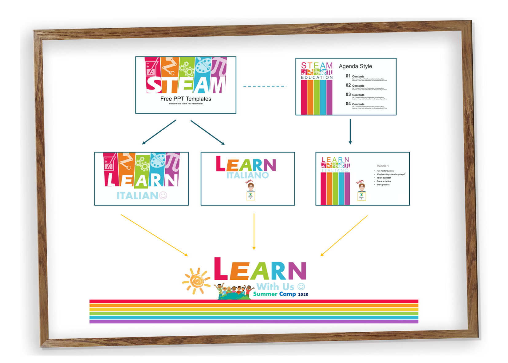 The idea of failing was terrible, this was the education of children, so the stakes were high, but I tried to gain more trust in my ability to handle whatever was coming my way. It may seem a paradox, but I did so by embracing discipline and encouraging myself to take more risks. I started getting firmly into the habit of maintaining a creative flow and messing around with PowerPoint as much as I could to become better at it, seeking that fabled ‘eureka’ moment. My first step was looking at existing online free templates to inspire me to create my own format. I ended up on fppt.com and luckily found two interesting slides on the theme of education: STEAM education.