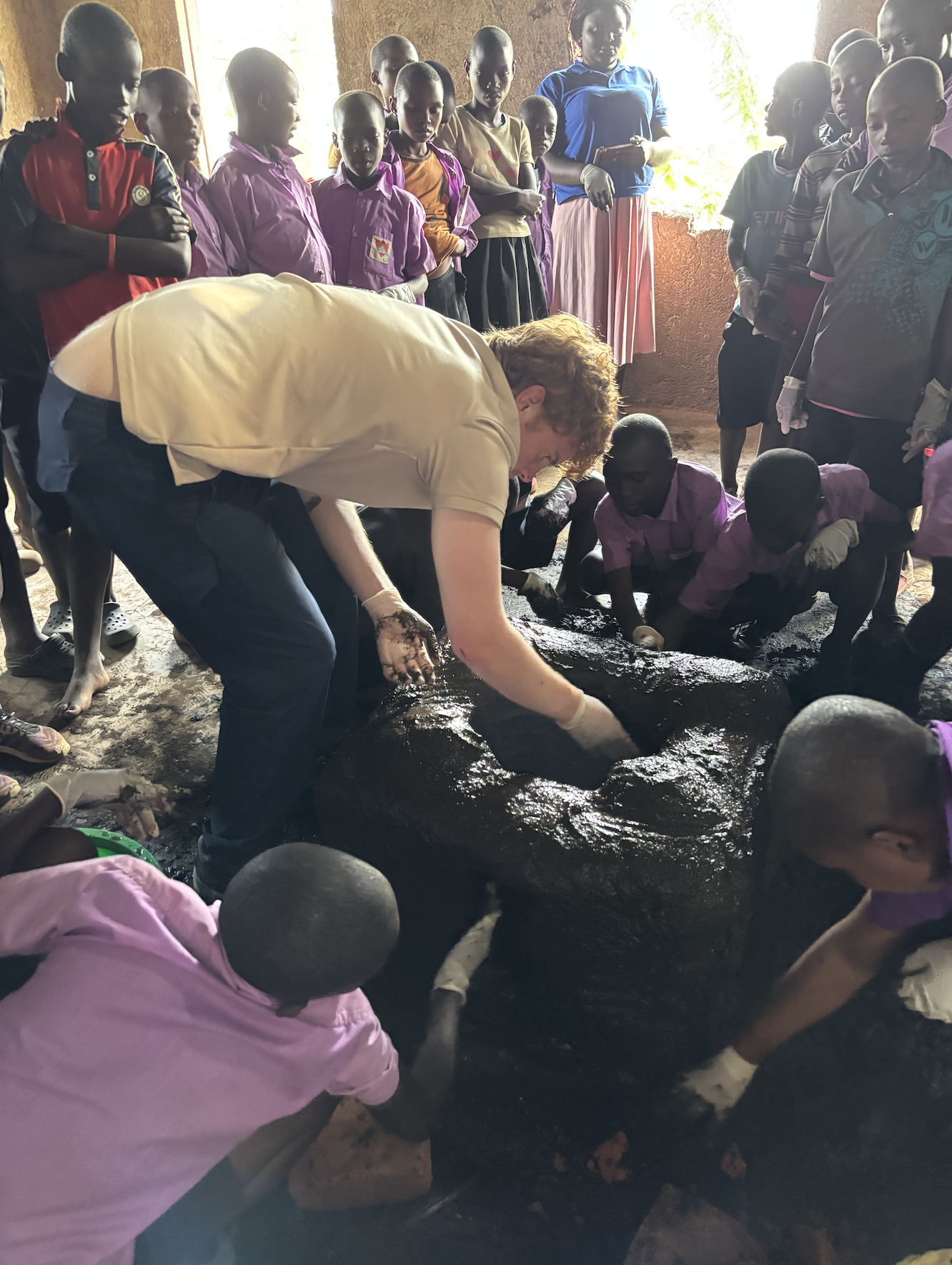 After the guest talk, I finished making educational materials for our birds, bats, and butterflies curriculum, including a log sheet, and then we headed out with Amy and Cathy to one of the schools for an improved cookstove demonstration in the afternoon. Improved Cookstoves (ICs) are stoves built using bricks and mud. We encourage students and families to use these types of stoves as opposed to traditional cookstoves (which are just three bricks with firewood stuck between them) because they burn fuel more efficiently and decrease the amount of smoke in the home, making them better for the environment and the respiratory health of their users. Our demonstration on Thursday included both a slideshow on the benefits of ICS as well as showing the students how to physically make the stoves themselves, while talking through each step.