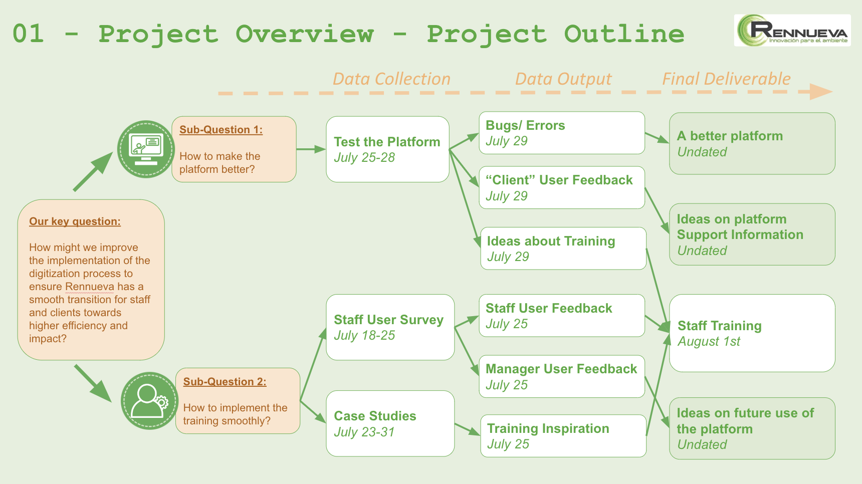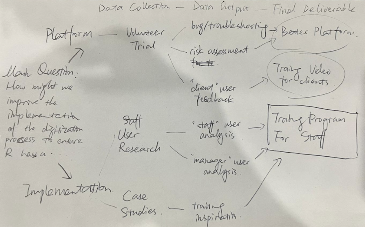 In the second week, with multiple visits to the Rennueva recycling plant and interactions with different people in Rennueva, we had a clearer idea of the project goals and timelines. Our team's key question for this project is: How might we improve the implementation of the digitization process to ensure Rennueva has a smooth transition for clients and staff towards higher efficiency and impact?