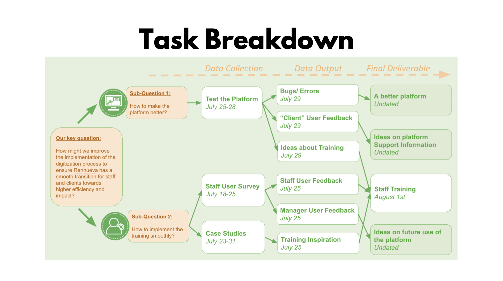 After collecting all the data, we provided feedback for the platform to Enrique and focused on developing training materials for staff members. We learned that video, interactive training, and manual would be helpful resources, and step-by-step workflow instruction would be desirable. We then met with Rennueva's communications team and learned that we can prioritize the manual and they will develop training videos later.