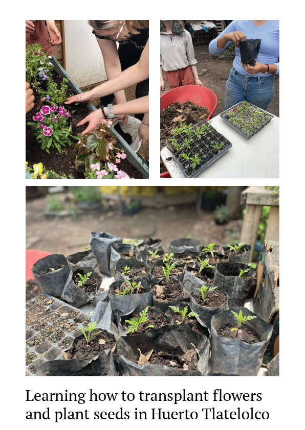 This week, we visited Huerto Tlatelolco, a model of urban sustainability that has regenerated and transformed an underutilized area into an educational and productive orchard, benefiting the local community in Mexico City. We were introduced to how sustainability is realized through the seed bank, the composite using worms and bacteria, the dry toilet, and plenty of organically nourished plants. The experience of the three projects in the orchard encloses us in the action of this community. Under guidance, we learned how to transplant flowers, plant seeds, and process composite with our hands and full hearts—meditating under the tree, touching the earth, harvesting the fruits, and enjoying the green salad we made together after the labour is a precious experience that reconnects us to the earth and reflects on our lifestyle.