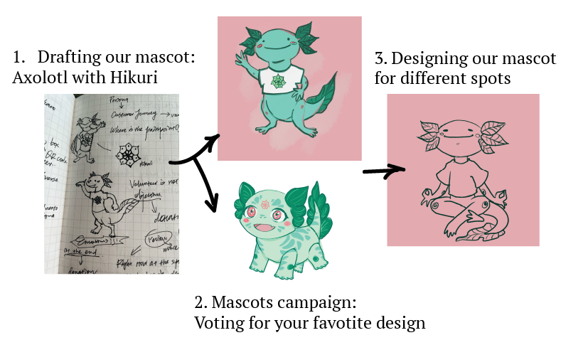 As the projects progressed, my main job this week was designing Huerto Roma Verde's mascot. The mascot is significant to our project because it will be a visual guide to attract and help people digest the information on the board and reinforce the community identity. I drafted out one of the first versions of the mascot, combining the Mexicans’ beloved animal axolotl and the shape of green leaves. Then, we hosted a mascot campaign to let the volunteers vote out their favourite version. After deciding on the version, I kept working with Nadia on the mascot's design. We aimed to make different mascot designs based on the various spots in Huerto Roma Verde. Nadia helped with the sketch, and I was to finalize them into illustrations. For example, the half-finished draft of the mascot shown in the picture is for a healing place where people can have meditation and therapy. Designing the mascot has been the most enjoyable part of the journey, as I fell deeper and deeper in love with the concepts and ideas that Huerto Roma Verde has been acting accordingly. The mascot is a visible cartoony figure that relates people to identify with the core concepts.