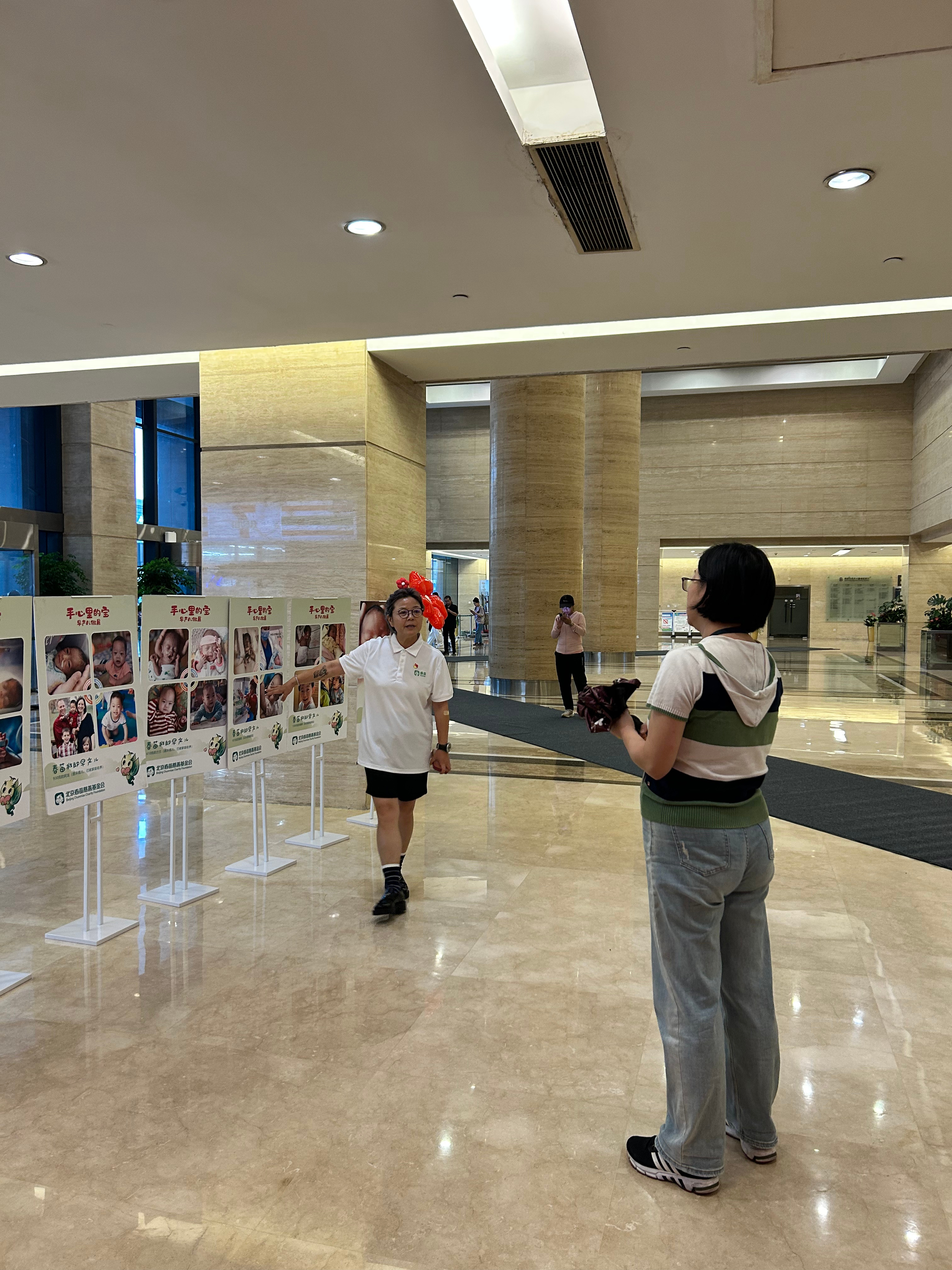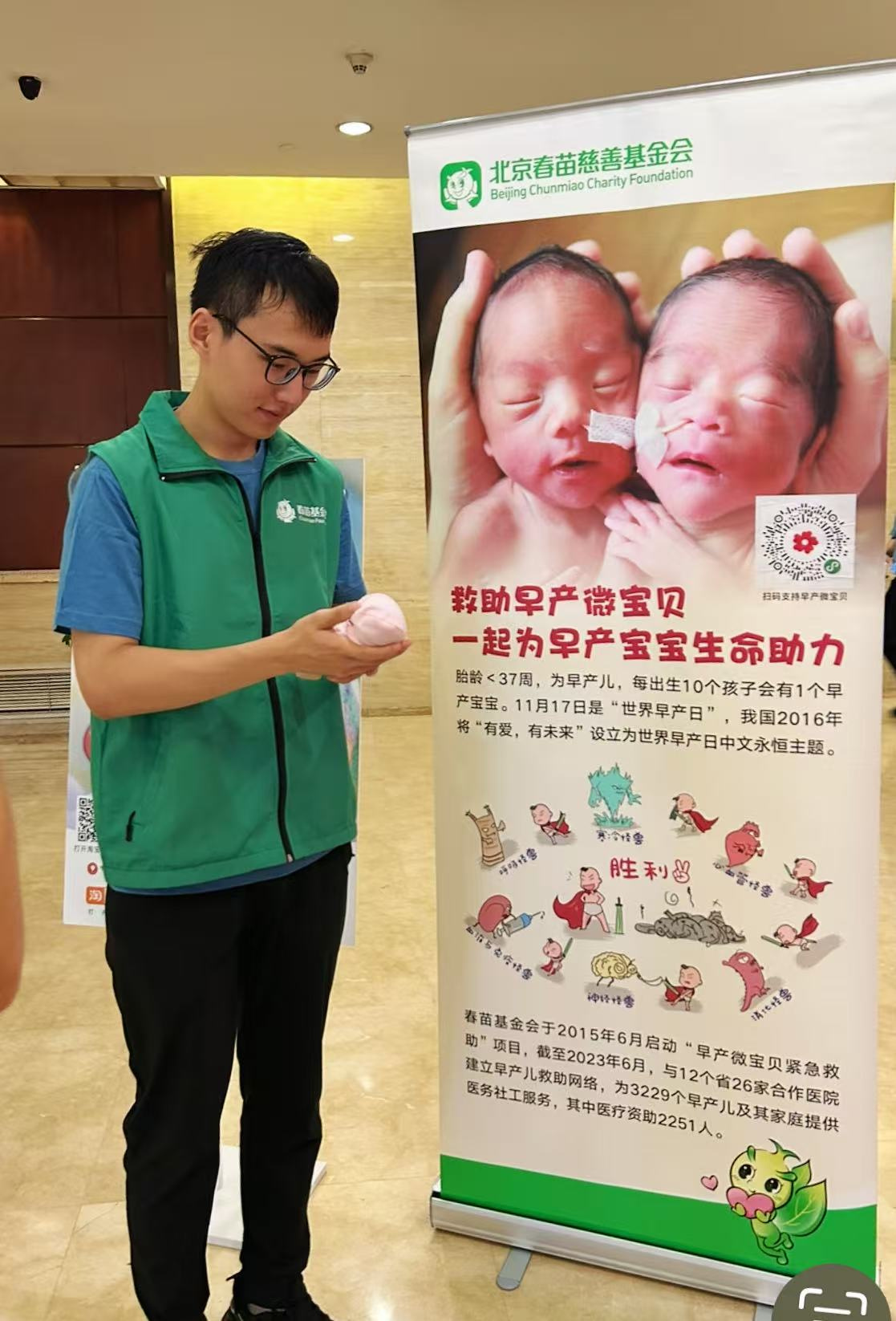 1. Offline Participation and Insights: I volunteered multiple times at the Foundation's offline awareness events. This gave me direct exposure to the public's genuine reactions to the 'premature infant' cause, from shock and hesitation upon seeing the hyper-realistic 26-week, 650 g baby model to being moved by stories of humane care such as 'kangaroo care' and 'octopus companions'. I experienced the entire donation solicitation process firsthand, from setting up booths and introductions, to establishing identity and explaining the significance, and making eye contact. I also observed the practical effectiveness of QR code-based micro-donation technology. Visiting the Bayi Hospital, a key paediatric transfer centre in northern China, helped me to understand the close collaborative network between the Foundation and the medical system, and the important role that social workers play in connecting families and doctors.