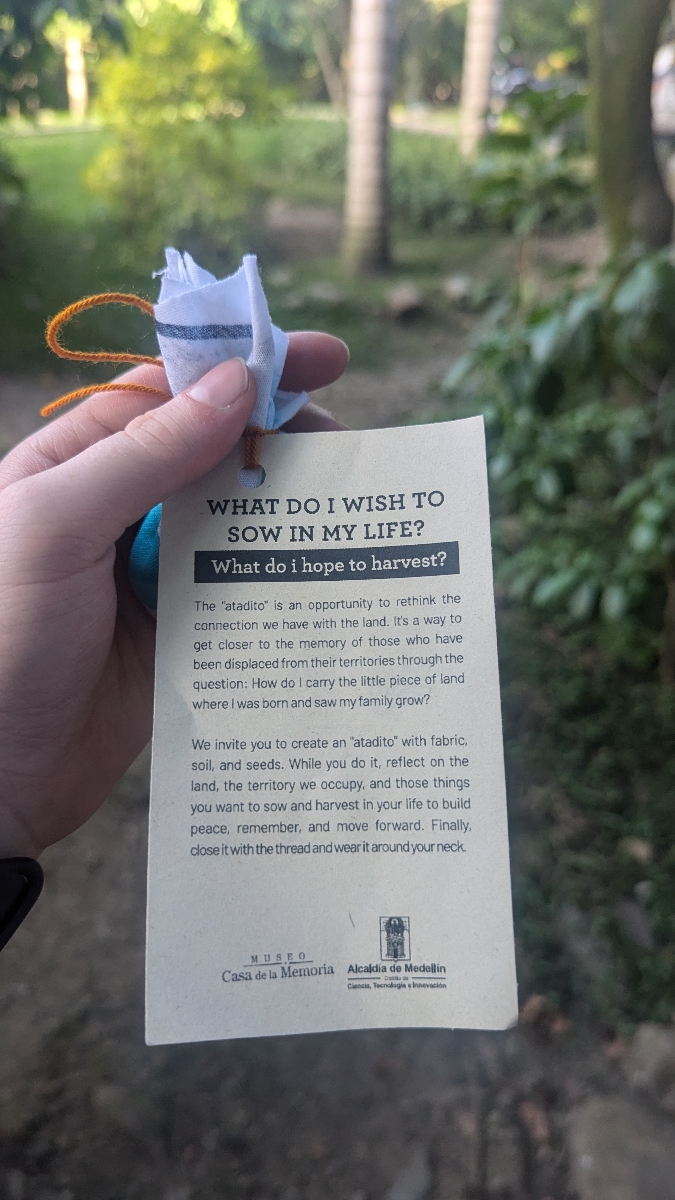 At the museum, we met a woman named Selina, who introduced us to the practice of creating an 'Adiato'. This involves placing soil on a cloth with a seed and a word that reflects something you wish to grow and flourish. I chose 'community'. We then tied the cloth and buried it, allowing a tree to grow and carry our intentions into the earth. This practice resonated deeply with me, encapsulating the spirit of Medellín’s journey of resilience and strength.