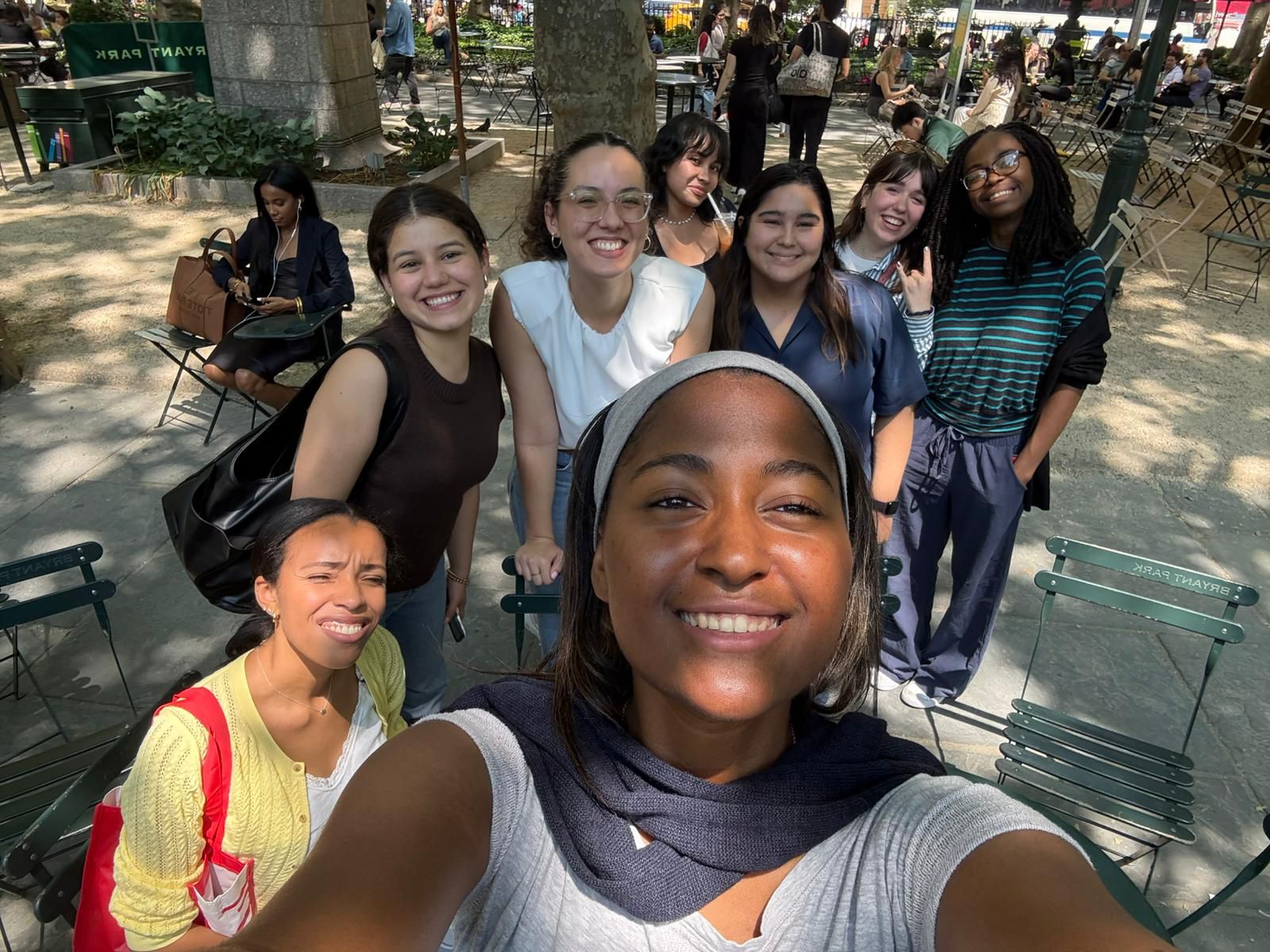 The conversations with my team are about mutual support. I am working with a cohort of other interns, many of whom are doing this type of work for the first time, or are assigned clients that do not speak the same language as them. We try to be a team and provide support for each other, specially when conversations with clients are very tough, or even when we have to team up to babysit a child while mom is getting interviewed. Furthermore, PR is a small, tight-knit, office space. Having that support from my peers and my supervisors is something I am really grateful for, since I can process and debrief over conversations healthily. This picture is of me and part of my cohort at Bryant Park eating lunch!