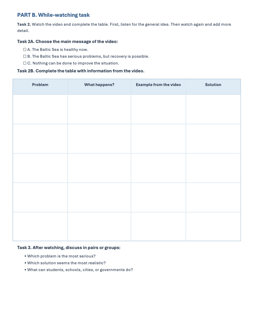 This week the project shifted from talking to making. After a conversation with the school administration, we decided that the lessons should be delivered in English, which turns the sessions into a chance to kill two birds with one stone: Baltic Sea awareness and English language practice tied to Matura (Polish A-levels) preparation. To make sure this was realistic, I reached out to English teachers at local schools to understand what level, vocabulary, and task types actually work for their students, and their input directly shaped how I built the materials. Most of my week was then spent at my desk designing the first lessons: a Baltic Sea mind-map activity to open the series, and a video-based lesson with pre-, while-, and post-watching tasks, along with teacher keys so the materials stay useful after I leave. It is one thing to know a topic, it is another to shape it into something a classroom can actually use.