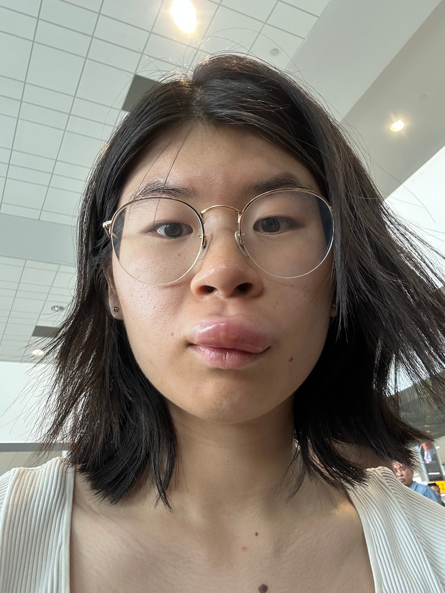 The absolute unique farm experience this week is definitely... get stung by a bee! Perhaps because the beekeepers were inspecting the artificial beehive, the bees were quite aggressive and defensive that day. One bee climbed into one of my nostril. Of course, I was scared and had to heavily sneeze it out. Then, the frantic bee stung me above my lips. Day 0 was fine, but the following day was clearly not. Fyi, my lips swelled like this: