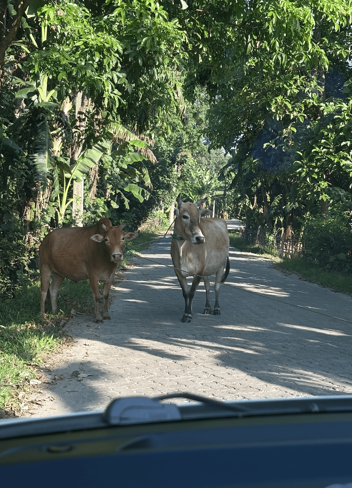 Hello from Majuli Island! It is a breathtaking place tucked away in the northeastern state of Assam, India. I feel incredibly lucky to be here, surrounded by lush greenery, the winding Brahmaputra River, and most importantly, a community that has welcomed me with such warmth and kindness. I’m staying in a cozy cottage alongside my project partner, Bhagya Nair, and our little haven is part of a cluster of cottages that share a lovely restaurant where we enjoy traditional meals from the local Mising tribe. Our daily commute to work is anything but ordinary. We navigate curvy roads filled with cows, goats, roosters, and the occasional monkey!