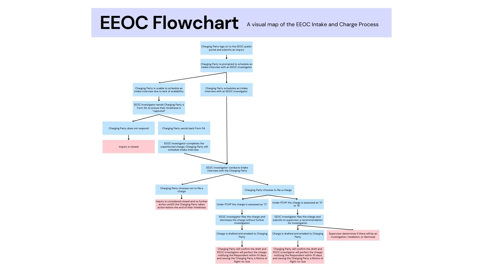 Another part of the background about the EEOC that I had to learn is what they actually ‘do.’ While I knew that they had the power of enforcement of the statutes I learned about previously, I was still unsure of what that enforcement actually looked like. From their creation, “the EEOC has the authority to investigate charges of discrimination against employers who are covered by the law. Our role in an investigation is to fairly and accurately assess the allegations in the charge and then make a finding.” The way that this happens is through the intake process. I have tried to recreate the basic layout of the process that the EEOC undergoes through this flow-chart: